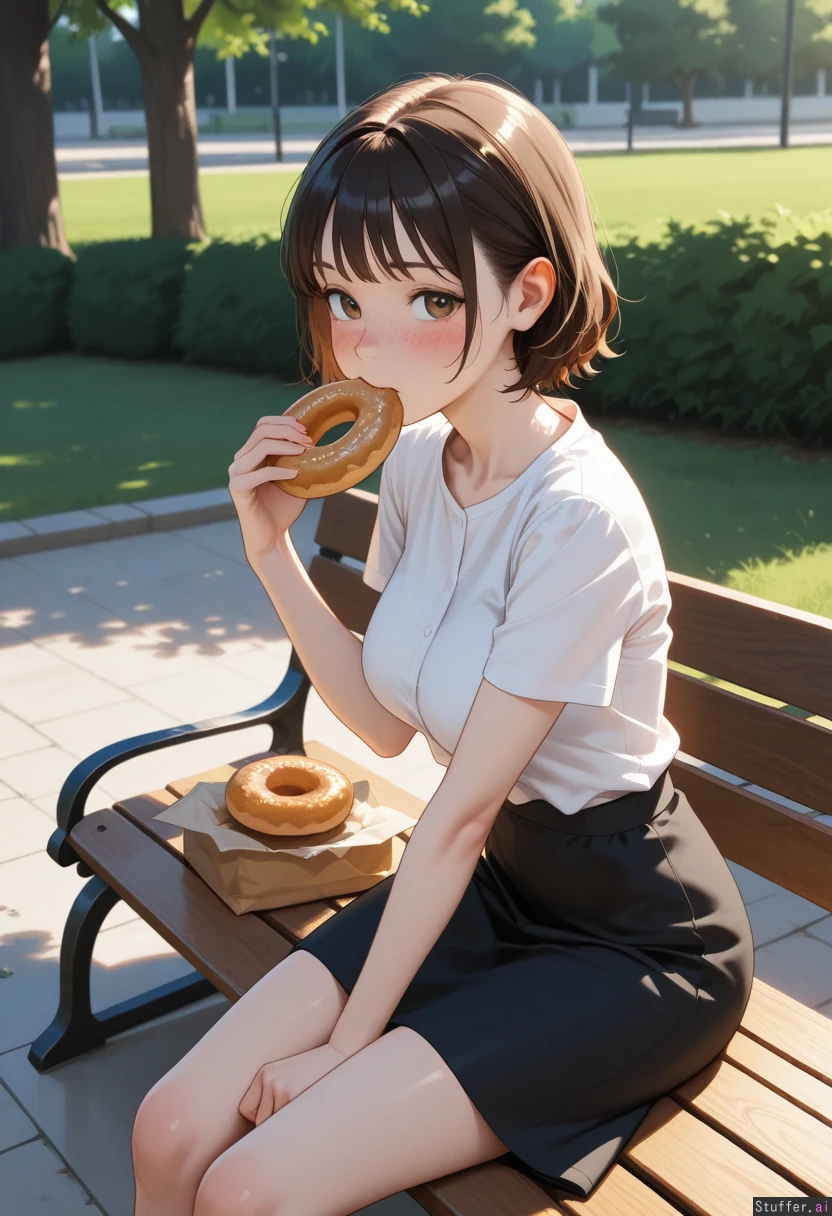 High quality, vivid details, semi realistic, natural light, side view, pov 20 years old, pale skin, beautiful face, brown eyes, brunette, freckles, bangs, short hair, black skirt, white blouse (Eating donut, sitting on park bench, blushing, embarrassed, horny) ((Skinny)) ((Large breasts:1.0)) ((Wide hips:1.0))
