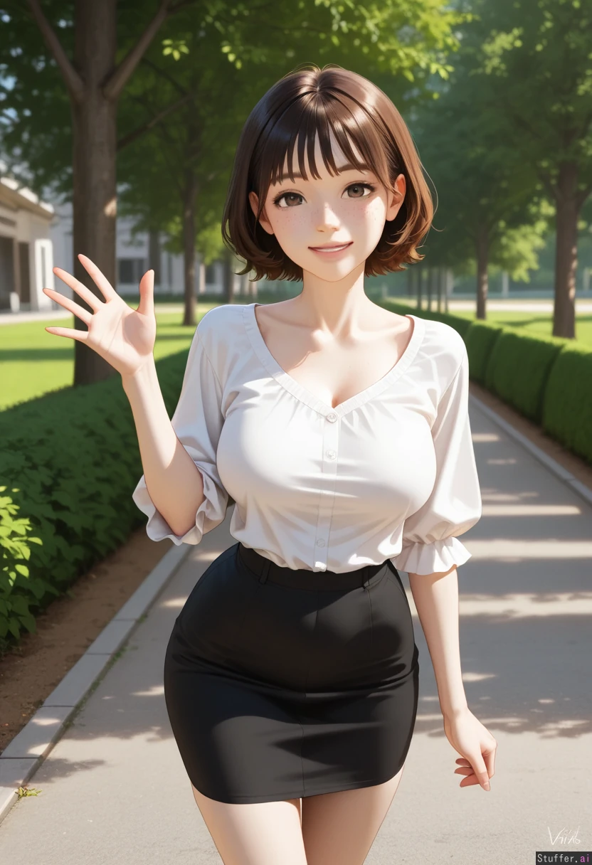 High quality, vivid details, semi realistic, natural light 20 years old, pale skin, beautiful face, brown eyes, brunette, freckles, bangs, short hair, black skirt, white blouse (Smiling, waving, walking in the park) ((Skinny)) ((Large breasts:1.0)) ((Wide hips:1.0))