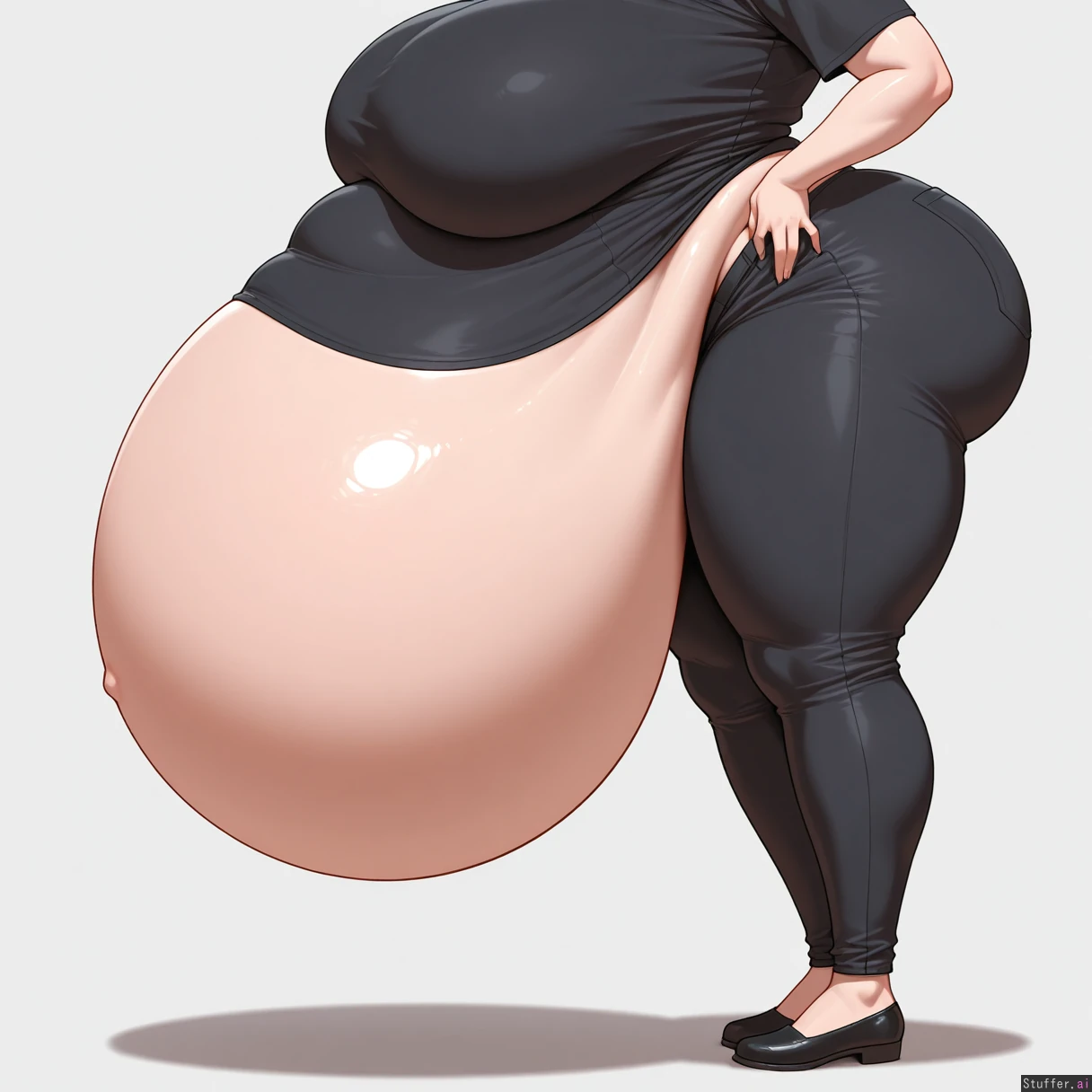 ,masterpiece,best quality,amazing quality, solo female, black shirt, black pants, standing, massive breasts, big butt, super fat legs, ((massive bloated belly: 1.3)), white background, side view, half lidded eyes, full body view, head_out_of_frame,