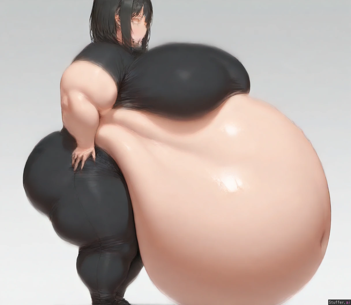 ,masterpiece,best quality,amazing quality, solo female, black shirt, black pants, standing, massive breasts, big butt, hyper fat, obese, immobile, fatty, fat arms, fat legs, ((massive bloated belly: 1.3)), white background, side view, half lidded eyes, full body view, head_out_of_frame,