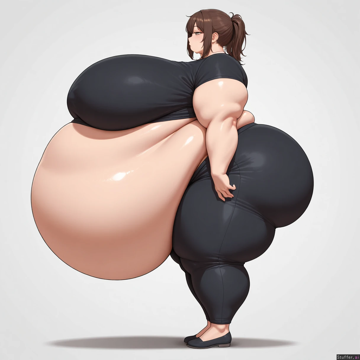 ,masterpiece,best quality,amazing quality, solo female, black shirt, black pants, standing, massive breasts, big butt, hyper fat, obese, immobile, fatty, fat arms, fat legs, ((massive bloated belly: 1.3)), white background, side view, half lidded eyes, full body view, head_out_of_frame,