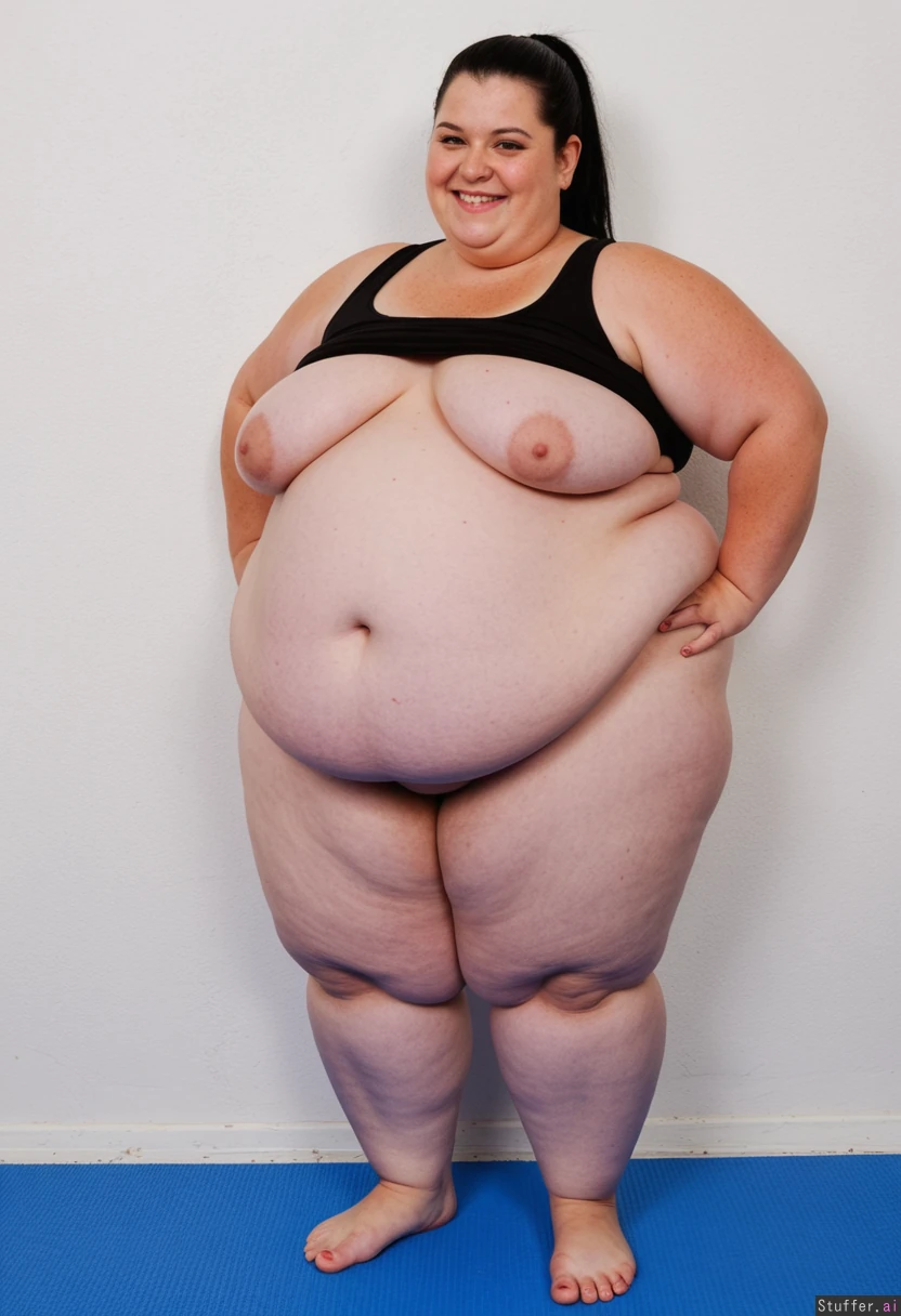 Huge fat hyper obese mature woman with a massive hyper obese belly smiling black hair ponytail barefoot standing