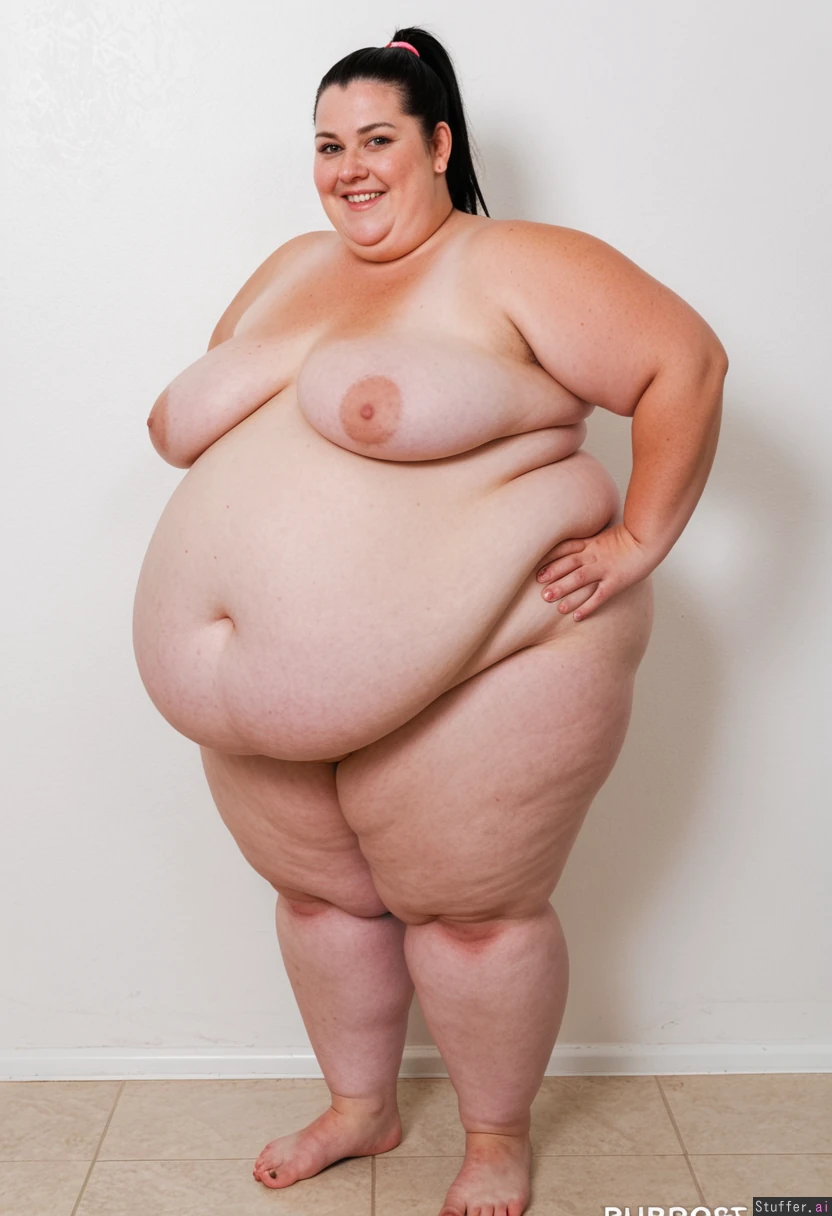 Huge fat hyper obese mature woman with a massive hyper obese belly smiling black hair ponytail barefoot standing