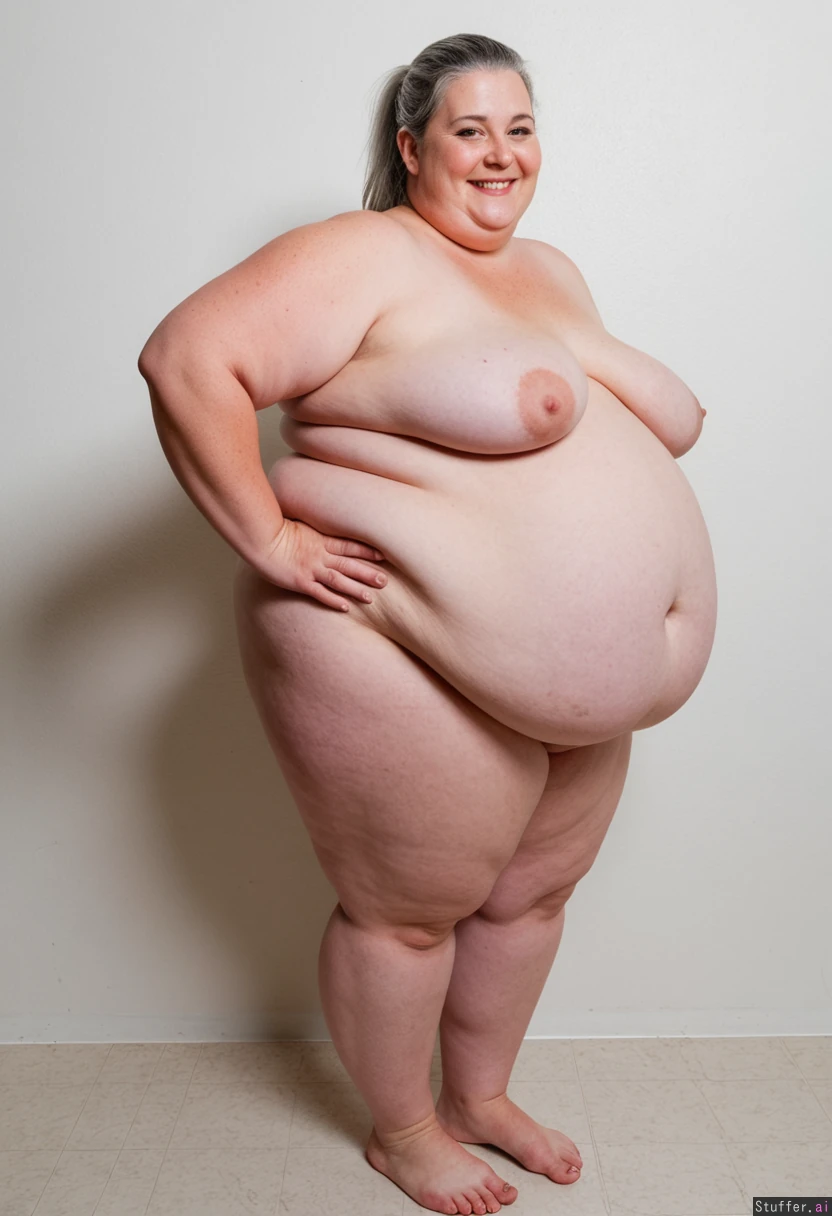 Huge fat hyper obese mature woman with a massive hyper obese belly smiling grey hair ponytail barefoot standing