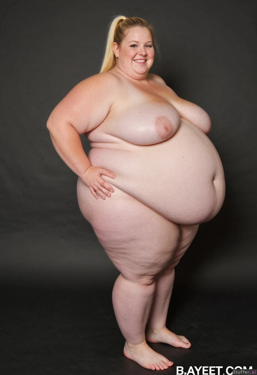 Huge fat hyper obese mature woman with a massive hyper obese belly smiling blonde hair ponytail barefoot standing