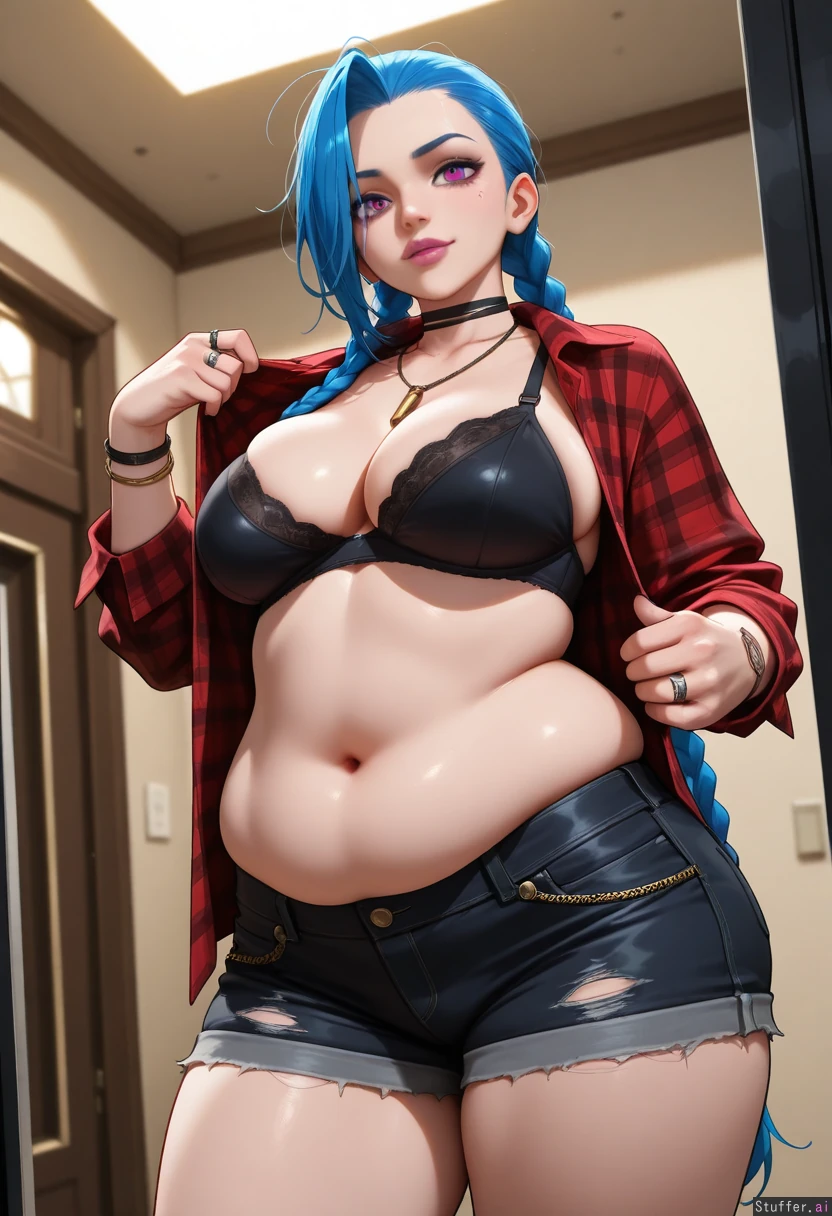 ((Ultra HD)), ((perfect lighting)) (photorealistic), masterpiece 1girl, Jinx(League of Legends), messy hair, choker, wearing red flannel shirt, open shirt, black bra, black cargo shorts, skindentation, goth makeup, purple nails, jewellery, rings, bullet necklace, multiple necklaces, multiple bracelets, tattoos Voluptuous figure, , vibrant blue hair, twin braids, long braids, gorgeous eyes, wide vibrant violet eyes, gorgeous eyes, beautiful pupils, beautiful round nose, , thick shoulders, chubby arms, cleavage, chubby belly, sexy round belly, wide fat hips, huge fat ass, fat shapely ass, (Magnificent punk aesthetic apartment),