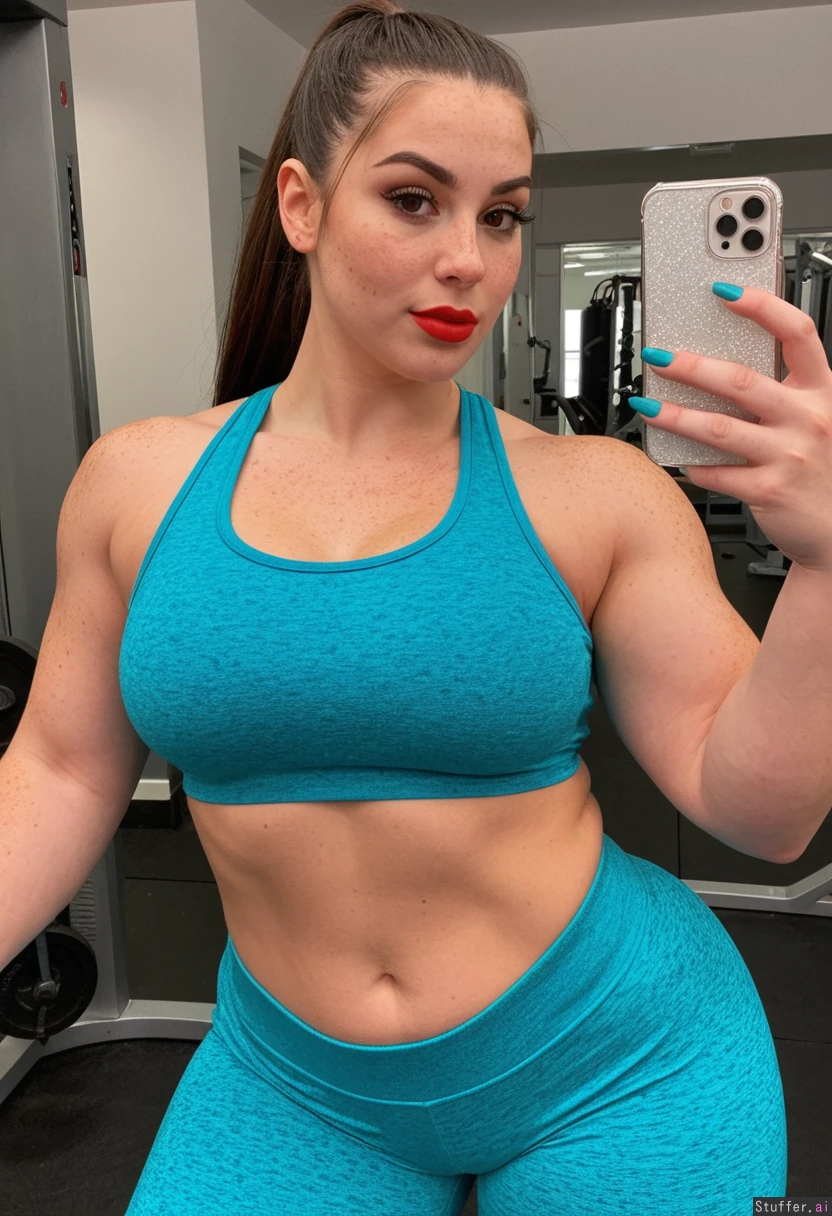 selfie ,20 year old, american,, fitness influencer ,brunette,, long ponytail hair , ( (brown eyes, round cheeks, cute nose, , red_lipstick, slight freckles ) )( , teal nails , perfect detailed hands, ) ( curvy, thick thighs, huge hips , Toned arms), cleavage Teal crop top, teal pants Gym