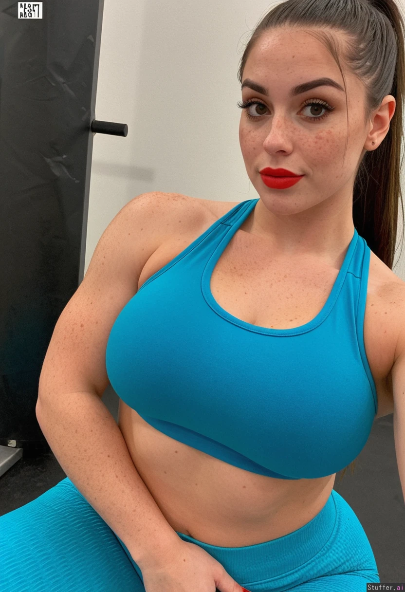 selfie ,20 year old, american,, fitness influencer ,brunette,, long ponytail hair , ( (brown eyes, round cheeks, cute nose, , red_lipstick, slight freckles ) )( , teal nails , perfect detailed hands, ) ( curvy, enormous thick thighs, , Toned arms), cleavage Teal crop top, teal pants Gym