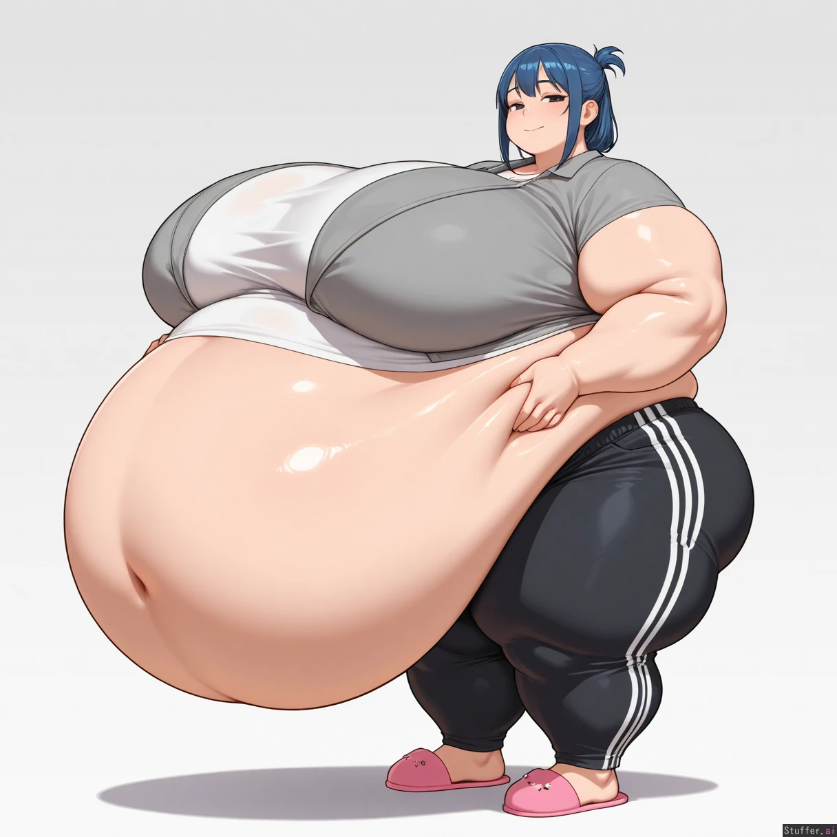 ,masterpiece,best quality,amazing quality, black eyes, blue hair, solo female, grey jacket, white shirt, black sweatpants, pink slippers, standing, ((massive breasts: 1.5)), massive, hyper fat, obese, immobile, fatty, (fat arms: 1.5), fat legs, super fat legs, obese legs, ((massive bloated belly: 1.4)), belly on ground, white background, side view, half lidded eyes, full body view, hands on belly, smiling, looking at viewer,