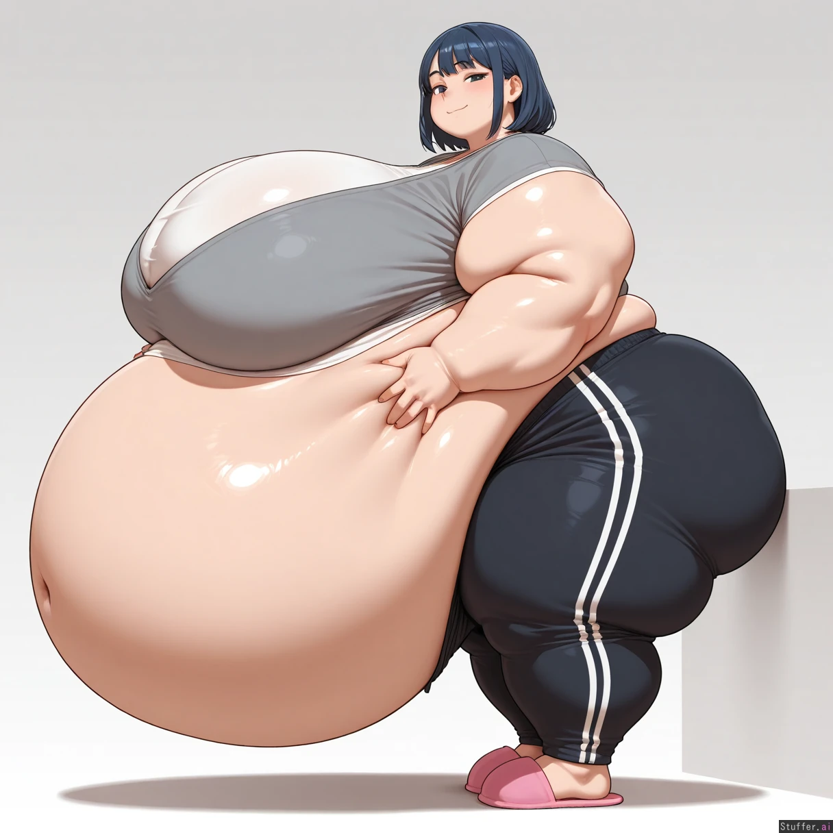 ,masterpiece,best quality,amazing quality, black eyes, blue hair, solo female, grey jacket, white shirt, black sweatpants, pink slippers, standing, ((massive breasts: 1.5)), massive, hyper fat, obese, immobile, fatty, (fat arms: 1.5), (fat legs: 1.2), fat ass, obese legs, ((massive bloated belly: 1.4)), belly on ground, white background, side view, half lidded eyes, full body view, hands on belly, smiling, looking at viewer,