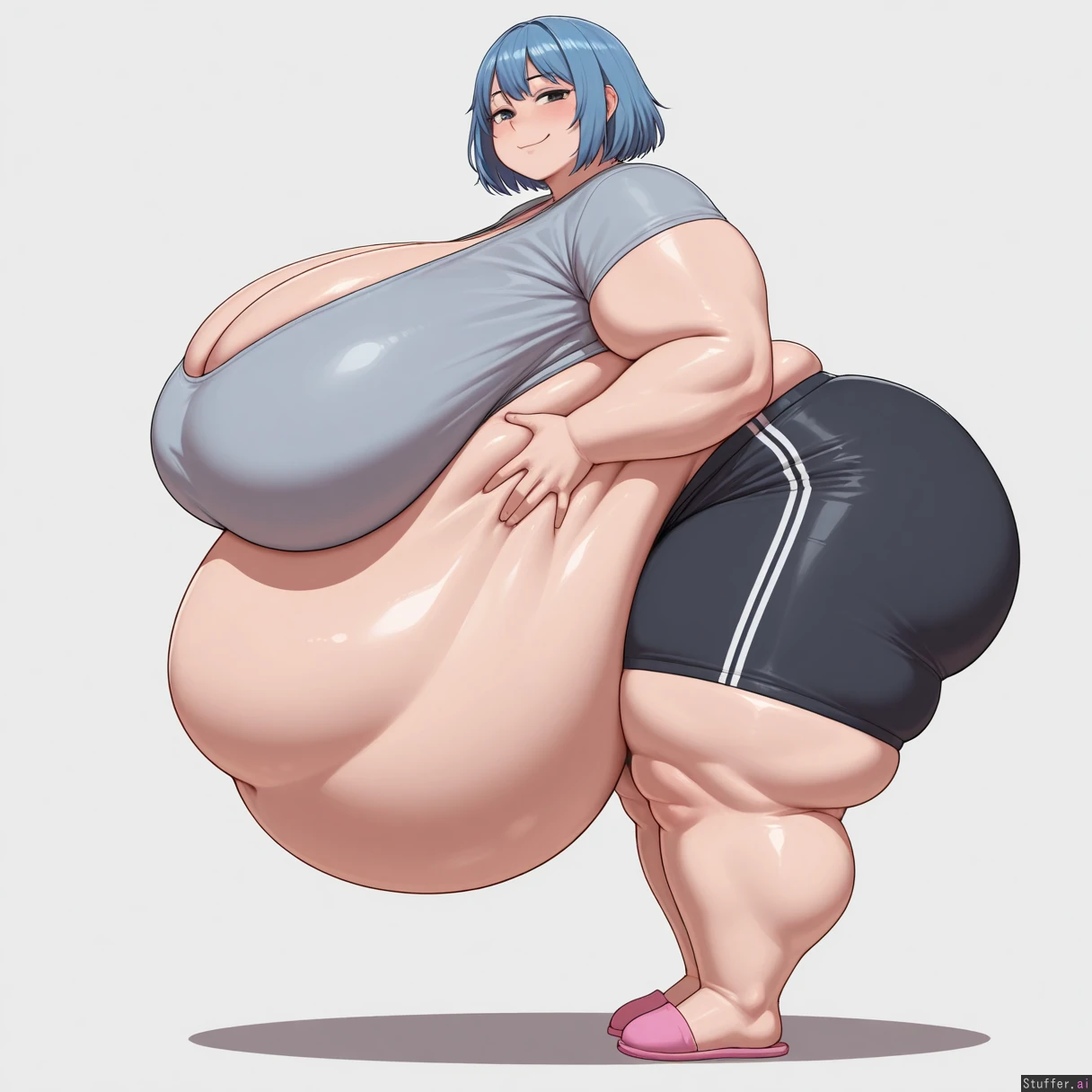 ,masterpiece,best quality,amazing quality, black eyes, blue hair, solo female, grey shirt, black sweatpants, pink slippers, standing, ((massive breasts: 1.5)), (fat arms: 1.2), (fat legs: 1.5), fat ass, obese legs, ((massive bloated belly: 1.4)), belly on ground, white background, side view, half lidded eyes, full body view, hands on belly, smiling, looking at viewer,