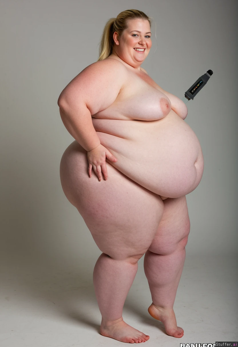 Huge fat hyper obese mature woman with a massive hyper obese belly smiling blonde hair ponytail barefoot standing