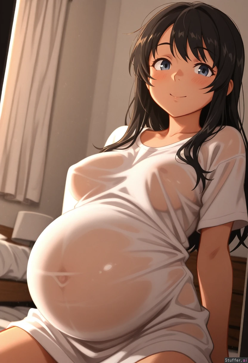 uhd, high resolution, flawless, best_quality, (hdr), beautiful face, beautiful eyes, Tweedabop(artist),khyle(artist) Solo, , medium_breasts, long_hair , cute_face, (belly_inflation), long_shirt , translucent_clothing , bedroom