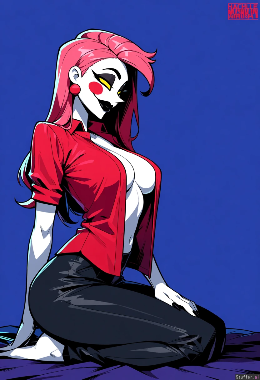 charlie_morningstar_(hazbin_hotel), white skin, open shirt, black lips, happy, kneeling, hand_on_stomach, side_view