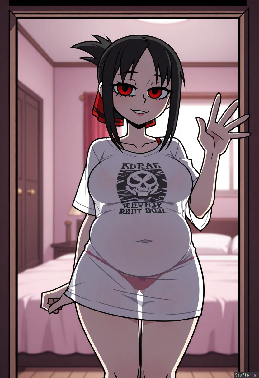 vanripper_(style), helluva_boss, see-through oversized shirt, panties, standing in a bedroom, looking at viewer, waving with one hand, pink lipstick, bellyheavy, (fat_body:1.0), (belly_expansion:1.0), shinomiya_kaguya