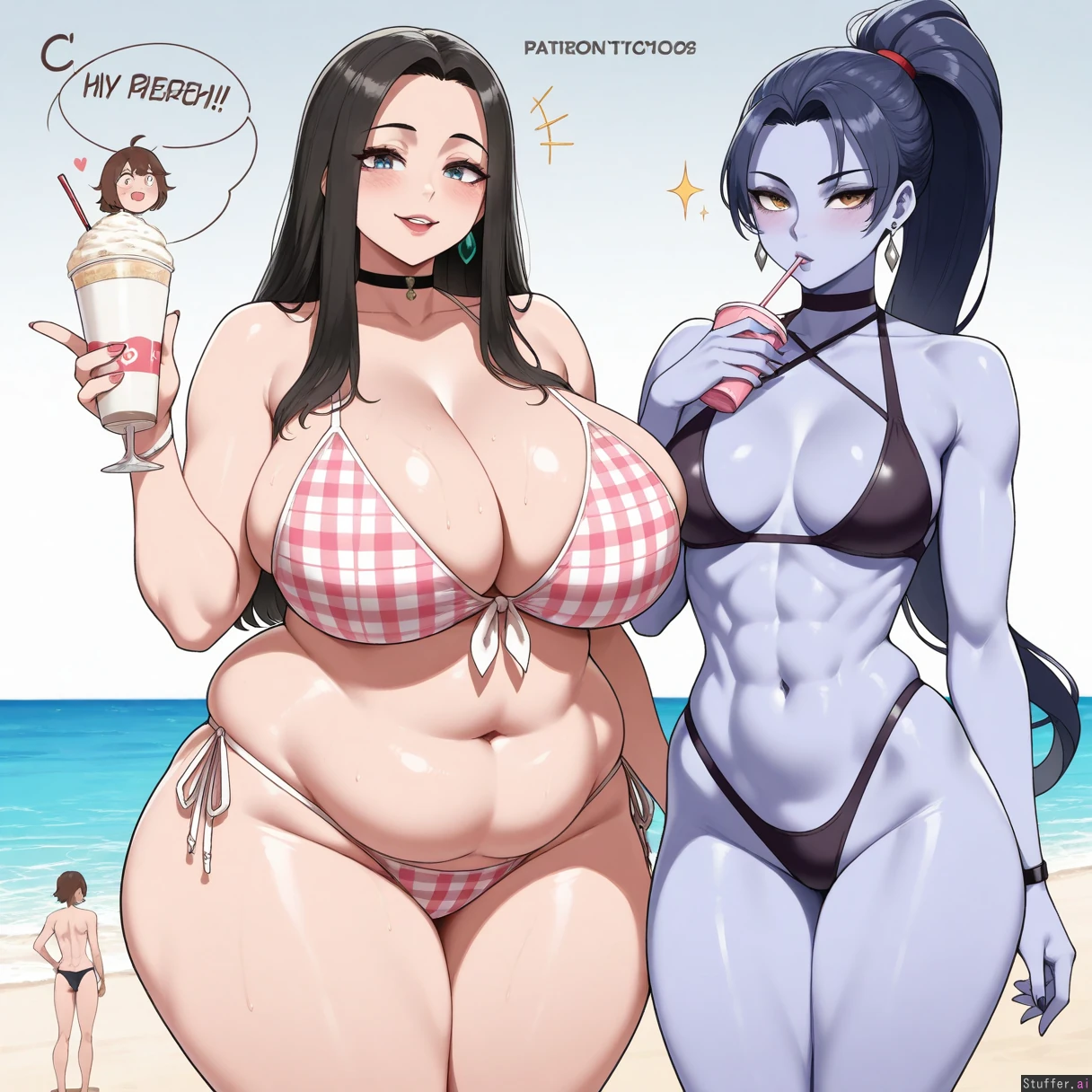 ((nyantcha)))), krekkov(artist):1.0, KAMII MOMORU(artist), c.cu(artist), araneesama(artist), (((Hyper detailed, masterpiece, flawless 10/10))) (((((Slim, toned athletic body:1.4))))) 8k, high resolution, gorgeous, masterpiece, ((flawless)), (((hyper detailed complex colors:1.6))), (((high rating))), ((highly detailed face)), beautiful face, ((((Athletic female)))), ((((she's a fat fetishist)))), ((((outside at the beach:1.5)))), ((((she's a fun-loving girl)))), (((sweaty & steamy))), ((((slim goth girl)))), (((((DVA))))), (((Widowmaker))), (((((two women standing together))))), (((((Slim, athletic))))), ((Hugging)) (((snug plaid bikini top, piercings & earrings))), (((Hyper morbidly obese:1.2))) (((cute, sexy, seductive, blushing))), (((((panting))))), front view, teasing with the viewer, drinking a milkshake, surprised by the taste,