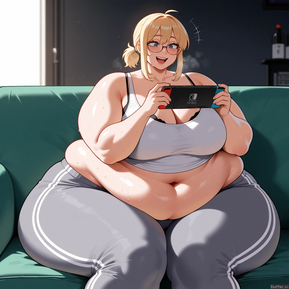 Masterpiece, best_quality, beautiful, vibrant colors, dim light, (1girl), nyantcha(artist), alone, blonde hair, short ponytail, blue eyes, front view, wide hips, gigantic thighs, sweating, panting, out of breath, big butt, excited, glasses, white tank top, black bra strap, grey sweatpants, sitting on green couch, happy, playing nintendo switch,(morbidly obese:1.35)