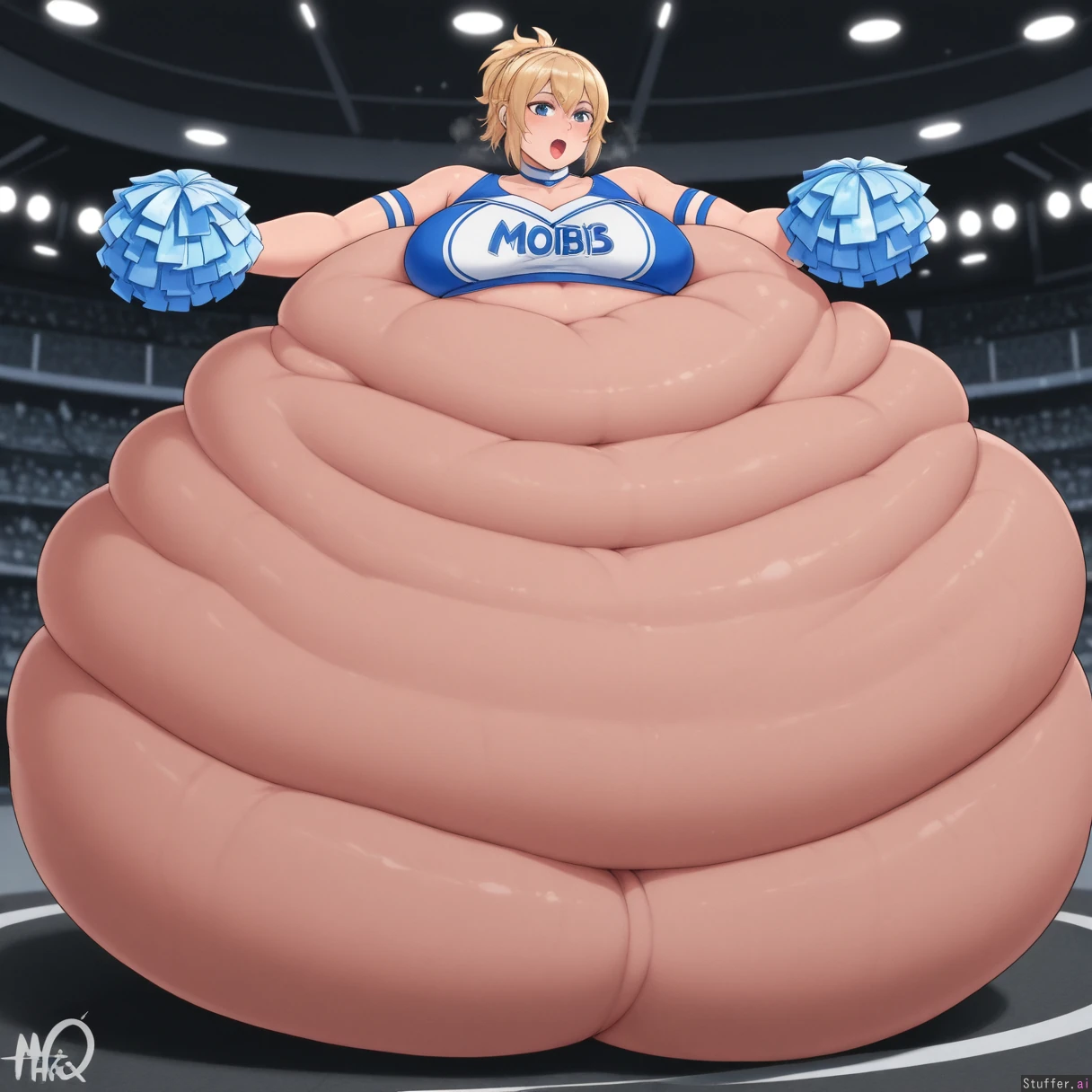 Masterpiece, best_quality, beautiful, vibrant colors, dim light, (1girl), nyantcha(artist), alone, blonde hair, short ponytail, blue eyes, front view, wide hips, gigantic thighs, sweating, panting, out of breath, fat ass, excited, blue cheerleading outfit, midriff, dynamic pose, stadium, posing, (morbidly obese:2.25)