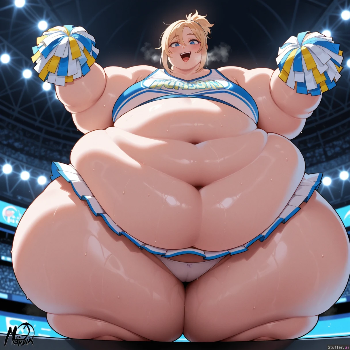 Masterpiece, best_quality, beautiful, vibrant colors, dim light, (1girl), nyantcha(artist), alone, blonde hair, short ponytail, blue eyes, front view, wide hips, gigantic thighs, sweating, panting, out of breath, fat ass, excited, blue cheerleading outfit, midriff, dynamic pose, stadium, jumping, upskirt, white panties, (morbidly obese:2.25)
