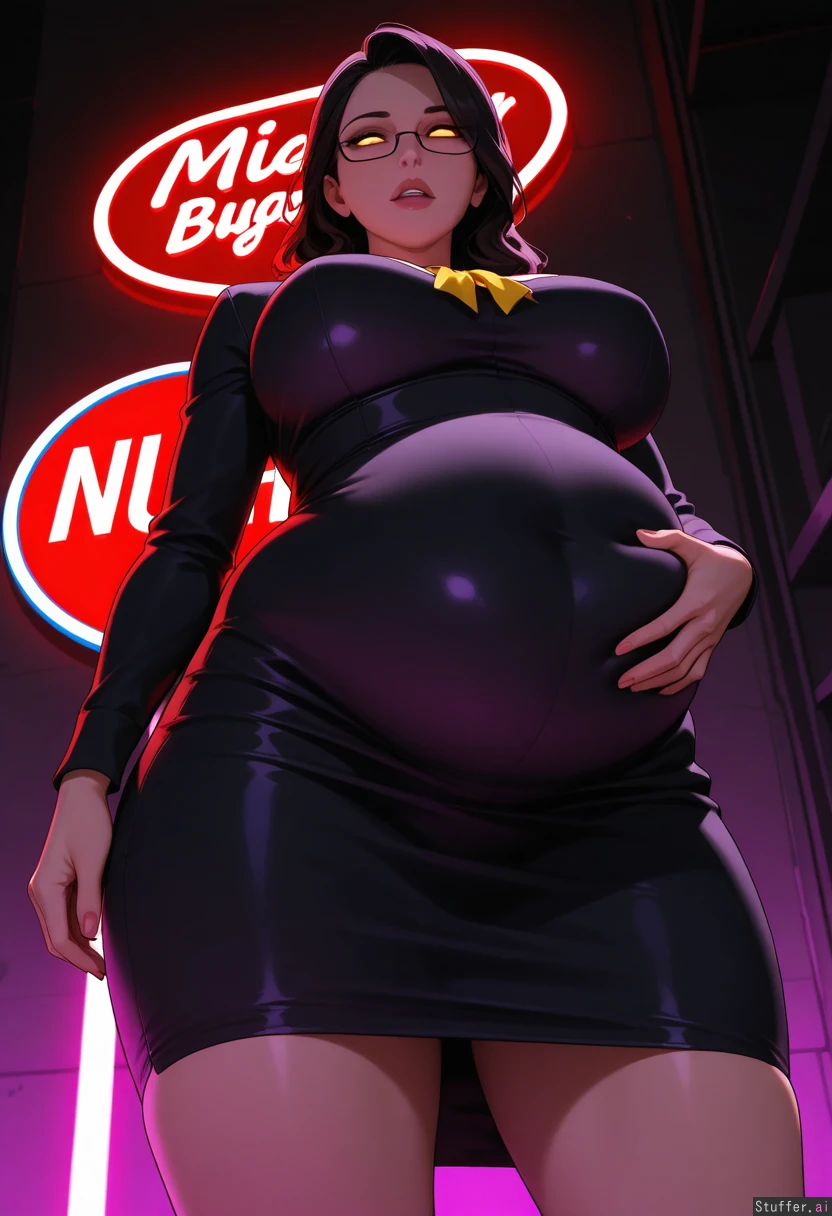 (Solo), Highres, Milf, Teacher, Dark hair, black short dress, svelte, rectangular_eyewear, huge belly, rolling eyes, hand on belly, low angle view, long sleeves, yellow handkerchief