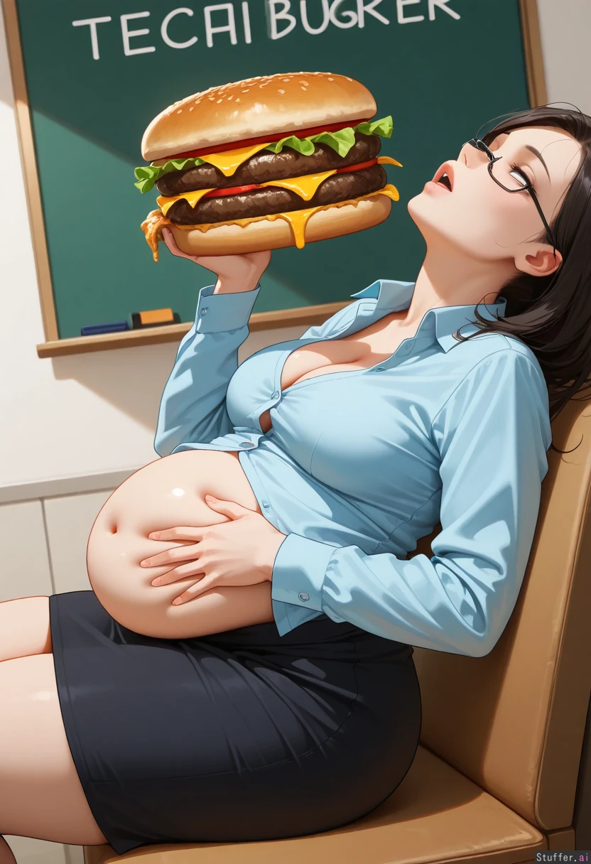 (Solo), Highres, Milf, Teacher, Dark hair, black miniskirt, light blue shirt, svelte, rectangular_eyewear, fat belly, rolling eyes, hand on belly, half closed eyes, button gaps, medium breasts, sitting, eating, leaning back, cleavage, side view, oversized burger, head back
