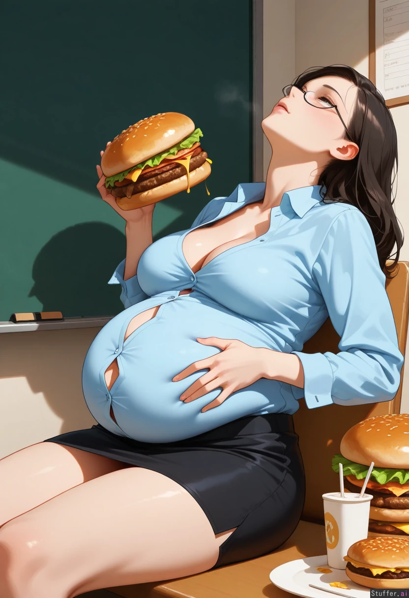 (Solo), Highres, Milf, Teacher, Dark hair, black miniskirt, light blue shirt, svelte, rectangular_eyewear, fat belly, rolling eyes, hand on belly, half closed eyes, button gaps, medium breasts, sitting, eating, leaning back, cleavage, side view, oversized burger, head back