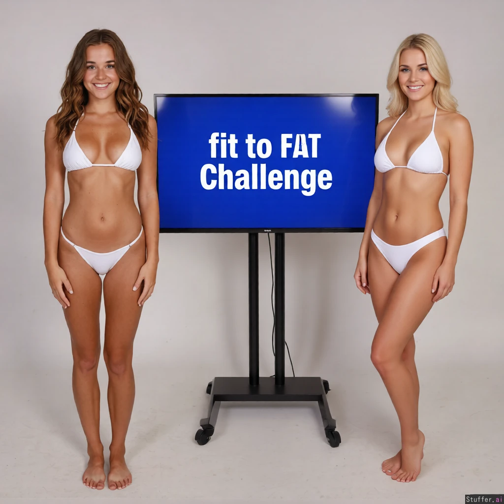 Add a blonde girl in a white bikini on the right side of the image. Add a tv screen in the middle of the girls with the text: fit to fat challenge.
