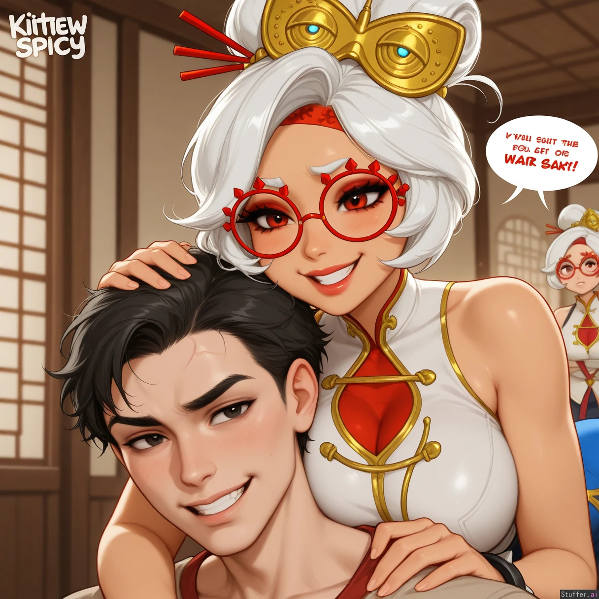 1male, anon, indoors, grin, angry, black hair, 1girl, chun-li, purah, (kittew(artist)), blushyspicy(artist),