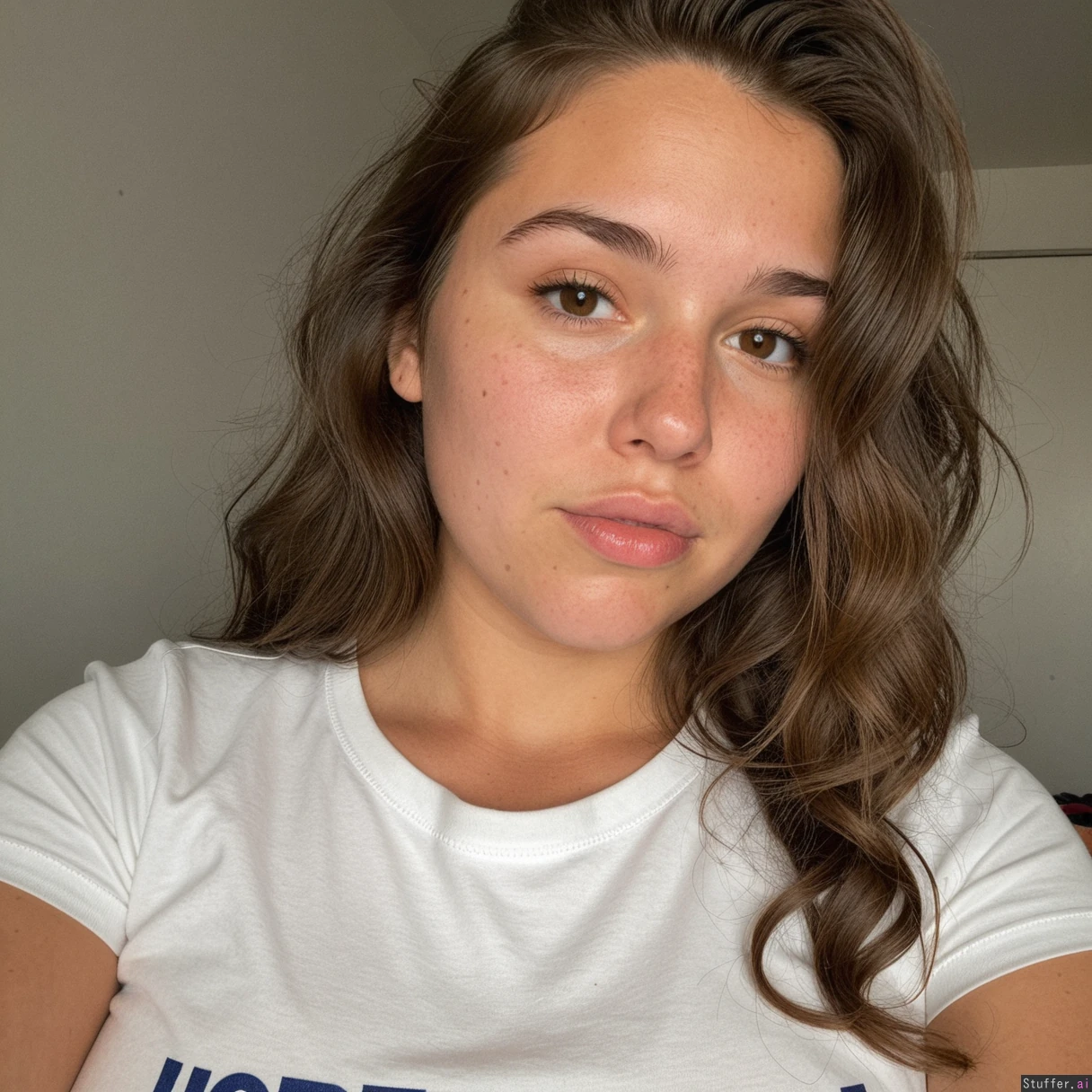 Instagram picture. Cute attractive 19 year dutch girl, ((have a young beautiful slightly fat face)), thick slightly wavy brown hair, slighly tanned. She is wearing a shirt.