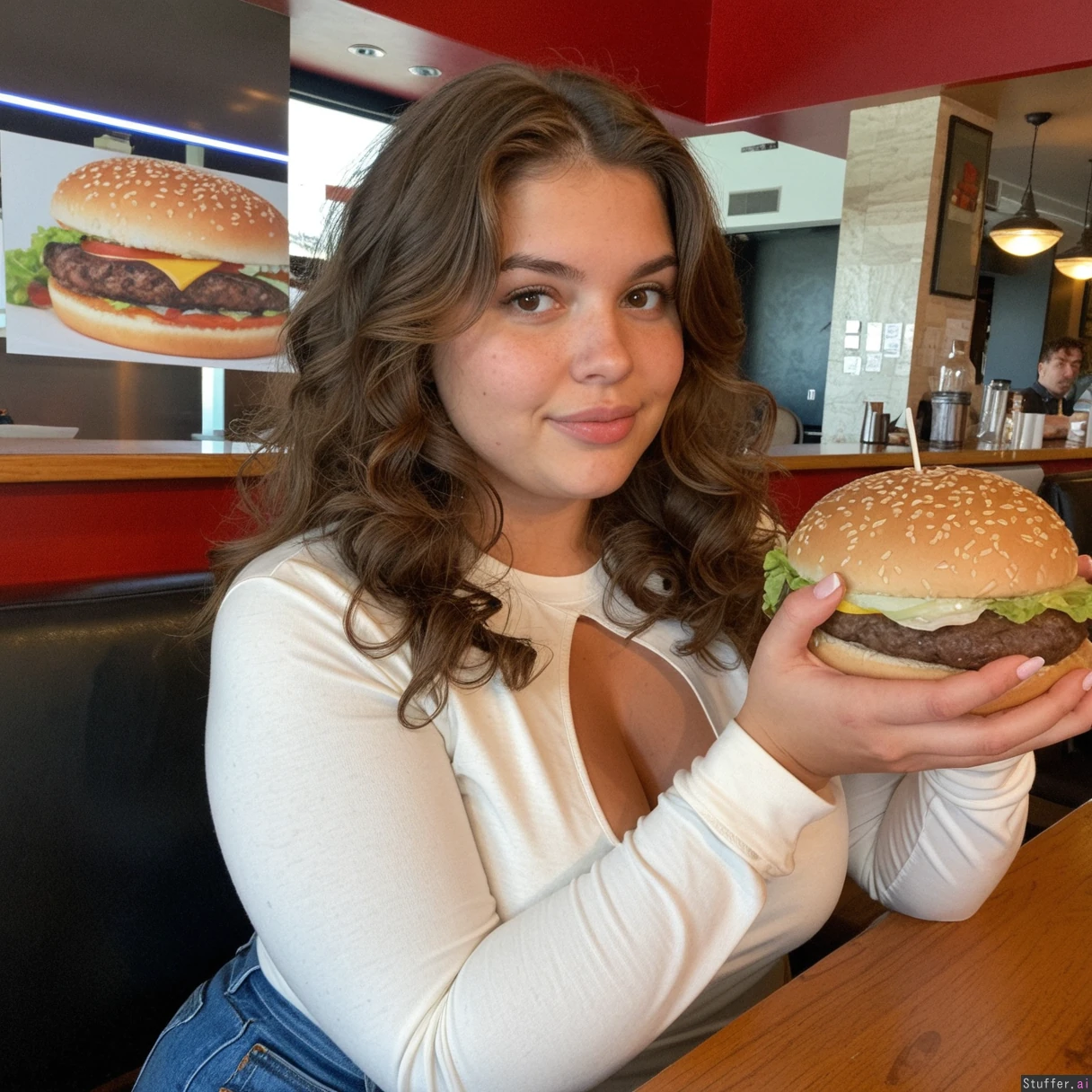Instagram picture. Cute attractive 19 year dutch girl, ((have a young beautiful slightly face)), thick slightly wavy brown hair, slighly tanned. Chunky body. She is wearing a tight long shirt and jeans. She is sitting in a restaurant holding big burger with two hands. The picture is taken from the other side of the table.