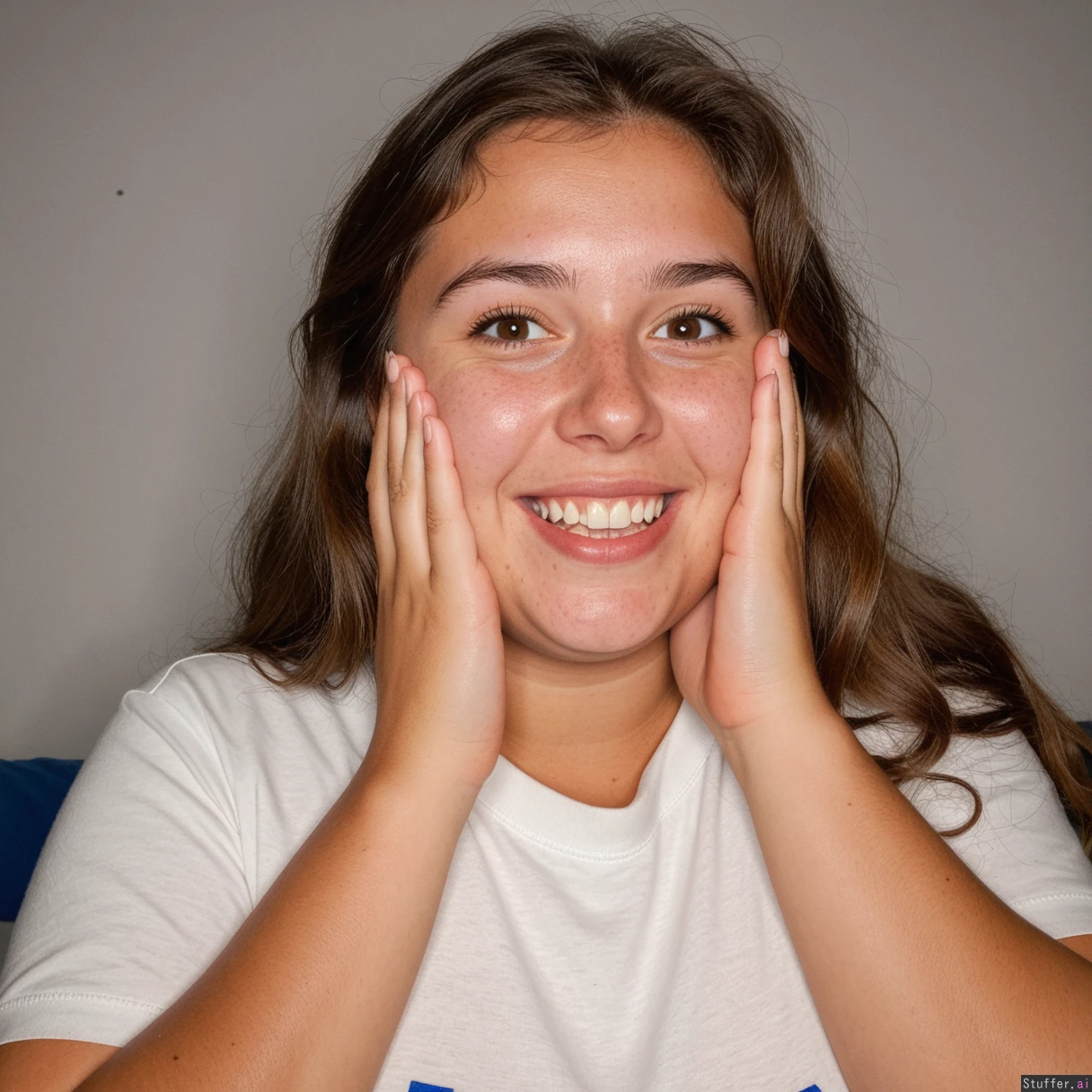 She is happy amazed. She is touching her face.