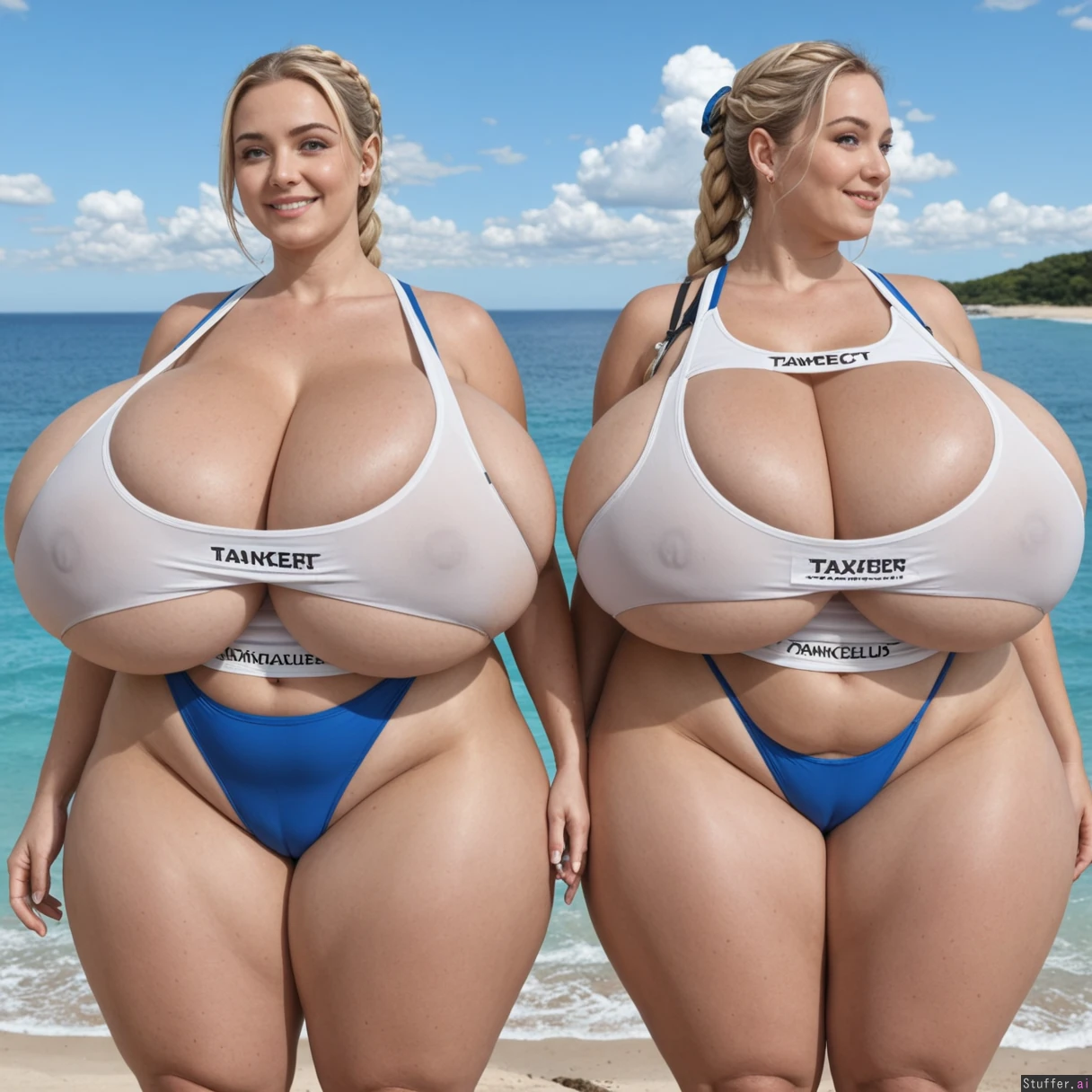 (((((An artfully composed, photorealistic, very atmospheric, ultra high quality photograph of one singular stunningly beautiful 18 year old blonde))))), (gigantic full wide hyper breasts in tanktop:2.3), (perfect fair skin:1.9), ((smiling at viewer)), (standing on an isolated tropical beach with a beautiful azure ocean background:1.6), (((side view:2.3))), (big sexy blue eyes:1.9), ((deliciously chubby:1.8)), ((((wide hips and thick thighs:2.2)))), (((extremely attractive face:2.0))), ((blue underwear:1.9)), ((French braid hair:1.9)). She is central in the picture.