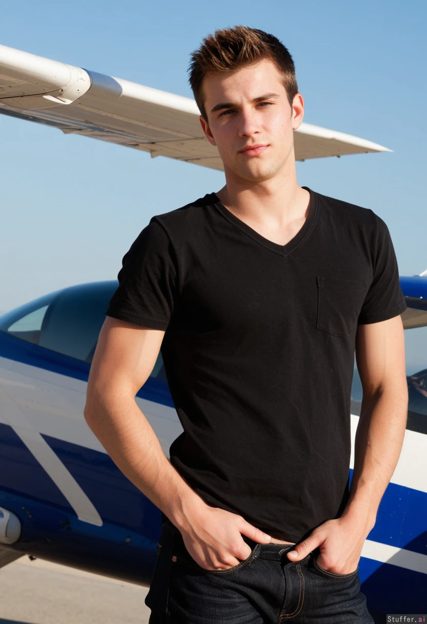 An attractive handsome 26 year old guy with a solid stocky tall build flying a small airplane. Wearing a black V-neck t-shirt and comfortable dark jeans.