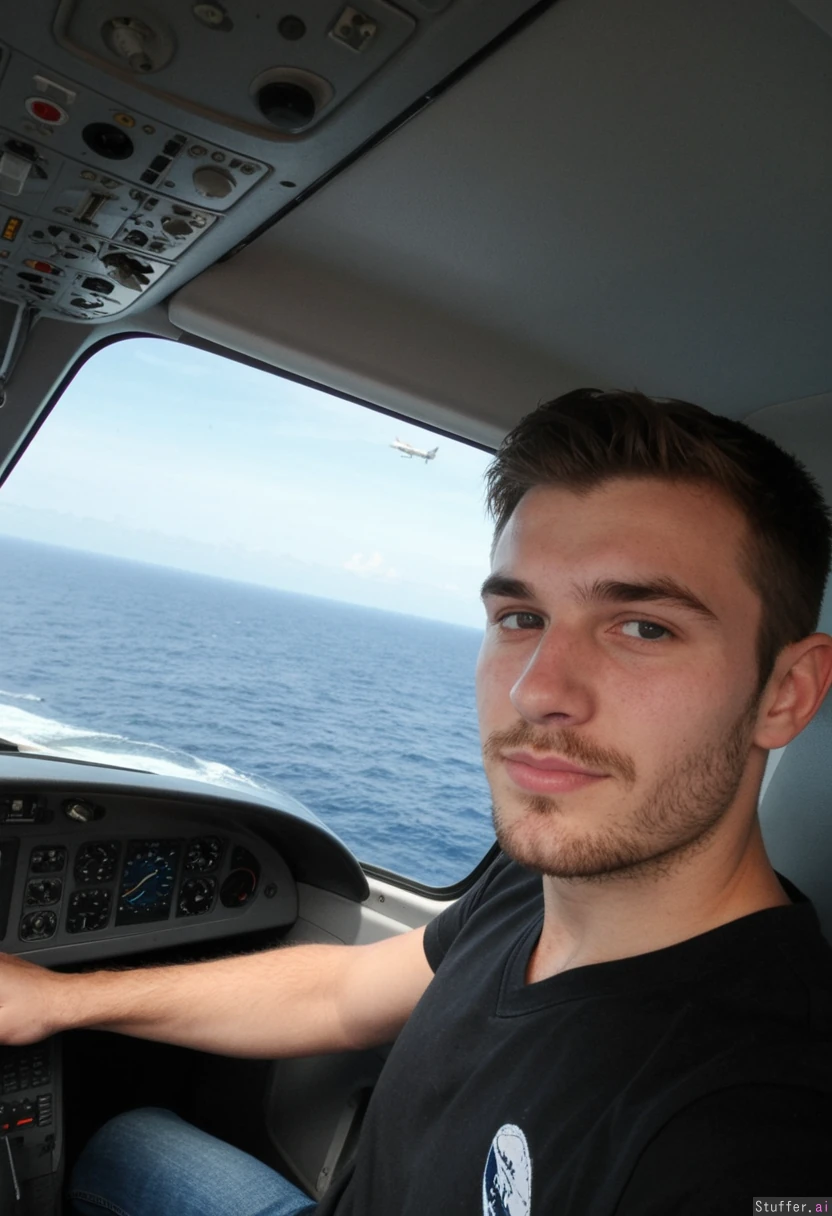 An attractive handsome 26 year old guy with a solid stocky tall build flying a small airplane. Wearing a black V-neck t-shirt and comfortable dark jeans. Light facial hair. Inside the plane in the cockpit. Flying over the ocean.