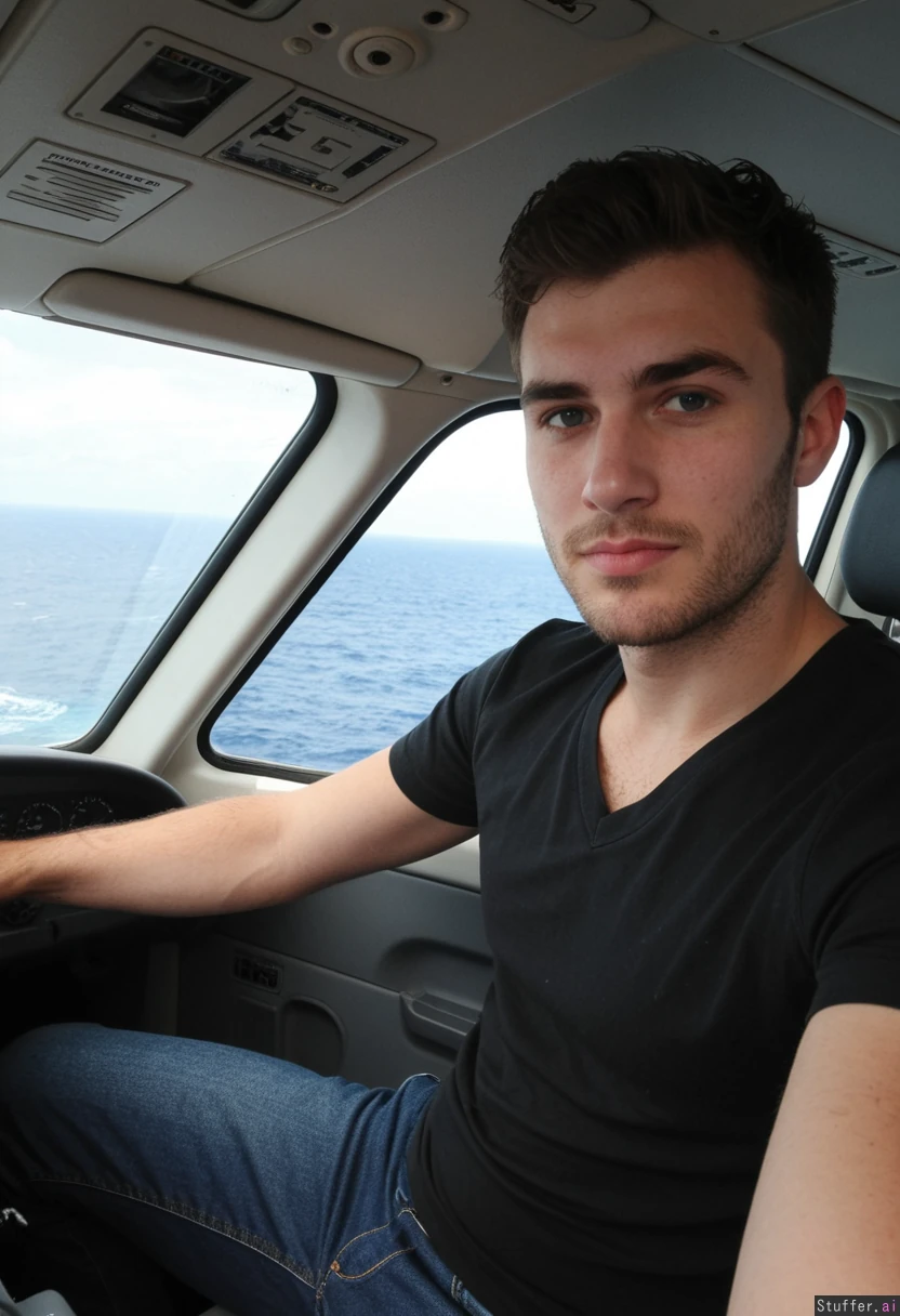 An attractive handsome 26 year old guy with a solid stocky tall build flying a small airplane. Wearing a black V-neck t-shirt and comfortable dark jeans. Light facial hair. Inside the plane in the cockpit. Flying over the ocean.