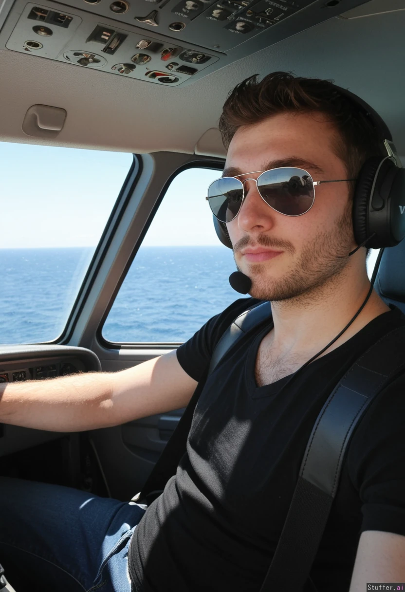 An attractive handsome 26 year old guy with a solid stocky tall build flying a small airplane. Wearing a black V-neck t-shirt and comfortable dark jeans. Light facial hair. Inside the plane in the cockpit. Flying over the ocean. Wearing an aviation headset and aviator sunglasses.