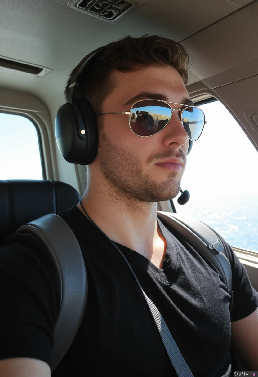 An attractive handsome 26 year old guy with a solid stocky tall build flying a small airplane. Wearing a black V-neck t-shirt and comfortable dark jeans. Light facial hair. Inside the plane in the cockpit. Flying over the ocean. Wearing an aviation headset and aviator sunglasses.