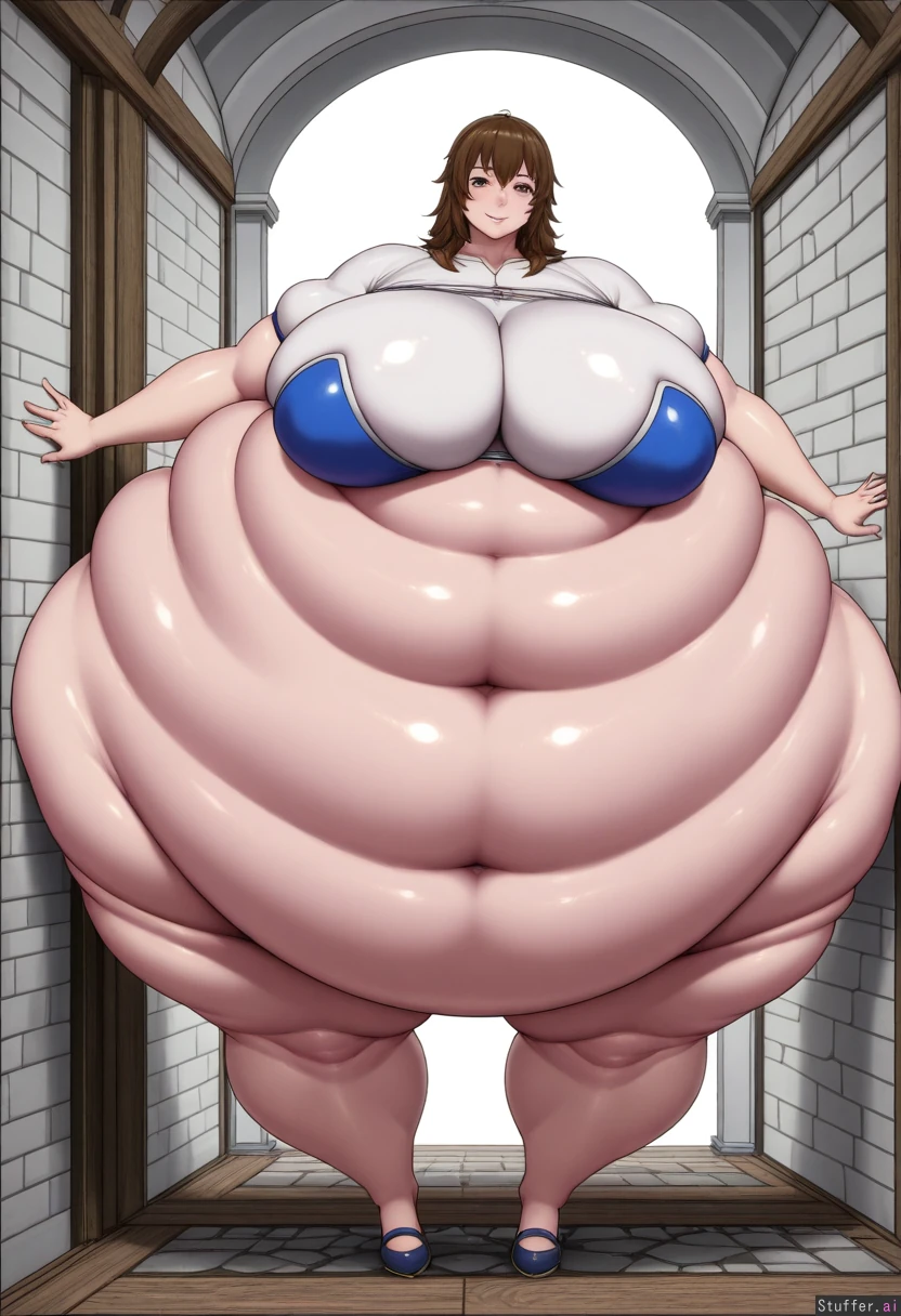 (simple colors, flat colors, simple shading), masterpiece, best quality, high rating, anime style 1girl, alone, solo, only one person, petite, fragile build, head in proportion to body, normal head size, realistic head-to-body ratio, brown hair, long brown hair, messy hair, wearing a poor ragged medieval dress, tattered dress, patched fabric, worn-out dress, simple linen dress, peasant dress, standing in a medieval corridor, stone hallway, castle corridor, arched windows, torches on walls, empty hallway, no other people, delicate frame, (big breasts:3.1), (thin chest:0.8), (wide hips:1.5), (natural belly button:1.2)(morbidly obese: 2.3), (extreme large belly: 1.9)(belly to the floor: 1.4), exposed belly, bare midriff, belly visible, stomach uncovered, crop top, midriff showing, wearing a poor ragged medieval dress with torn neckline, deep decolletage, chest exposed, low-cut top, revealing cleavage, dress falling off shoulders, bare upper chest sweating, sweaty skin, beads of sweat on forehead, perspiration on face, glistening skin, (long eyelashes:1.1), smiling, happy expression, slight smile, soft smile, gentle smile pale skin, slight blush on cheeks, (long legs: 1.6) (medieval europe background, stone walls, wooden beams, old corridor, atmospheric lighting, dramatic shadows), 3/4 view, semi-side view, from the side at an angle, full body shot, standing pose, cinematic framing