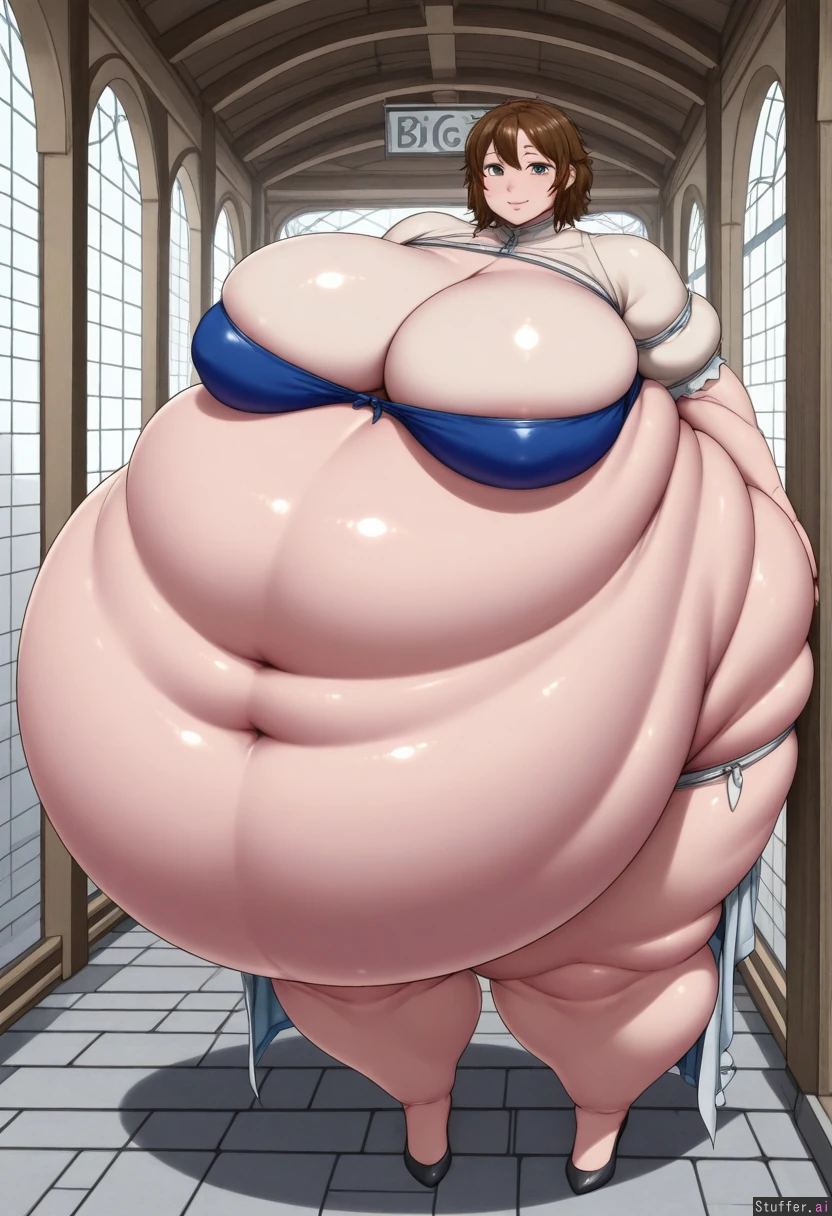 (simple colors, flat colors, simple shading), masterpiece, best quality, high rating, anime style 1girl, alone, solo, only one person, petite, fragile build, head in proportion to body, normal head size, realistic head-to-body ratio, brown hair, long brown hair, messy hair, wearing a poor ragged medieval dress, tattered dress, patched fabric, worn-out dress, simple linen dress, peasant dress, standing in a medieval corridor, stone hallway, castle corridor, arched windows, torches on walls, empty hallway, no other people, delicate frame, (big breasts:3.1), (thin chest:0.8), (wide hips:1.5), (natural belly button:1.2)(morbidly obese: 2.3), (extreme large belly: 1.9)(belly to the floor: 1.4), exposed belly, bare midriff, belly visible, stomach uncovered, crop top, midriff showing, wearing a poor ragged medieval dress with torn neckline, deep decolletage, chest exposed, low-cut top, revealing cleavage, dress falling off shoulders, bare upper chest sweating, sweaty skin, beads of sweat on forehead, perspiration on face, glistening skin, (long eyelashes:1.1), smiling, happy expression, slight smile, soft smile, gentle smile pale skin, slight blush on cheeks, (long legs: 1.6) (medieval europe background, stone walls, wooden beams, old corridor, atmospheric lighting, dramatic shadows), 3/4 view, semi-side view, from the side at an angle, full body shot, standing pose, cinematic framing