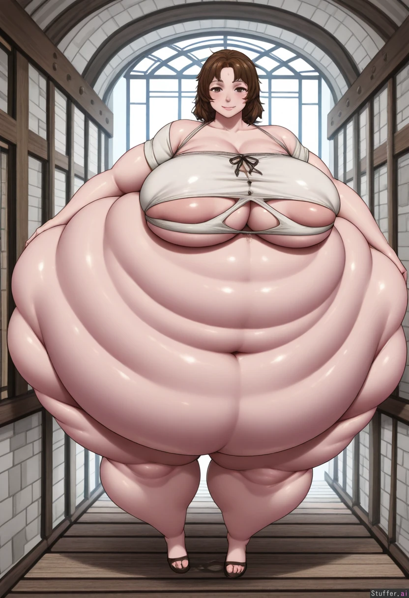 (simple colors, flat colors, simple shading), masterpiece, best quality, high rating, anime style 1girl, alone, solo, only one person, petite, fragile build, head in proportion to body, normal head size, realistic head-to-body ratio, brown hair, long brown hair, messy hair, wearing a poor ragged medieval dress, tattered dress, patched fabric, worn-out dress, simple linen dress, peasant dress, standing in a medieval corridor, stone hallway, castle corridor, arched windows, torches on walls, empty hallway, no other people, delicate frame, (big breasts:3.1), (thin chest:0.8), (wide hips:1.5), (natural belly button:1.2)(morbidly obese: 2.3), (extreme large belly: 1.9)(belly to the floor: 1.4), exposed belly, bare midriff, belly visible, stomach uncovered, crop top, midriff showing, wearing a poor ragged medieval dress with torn neckline, deep decolletage, chest exposed, low-cut top, revealing cleavage, dress falling off shoulders, bare upper chest sweating, sweaty skin, beads of sweat on forehead, perspiration on face, glistening skin, (long eyelashes:1.1), smiling, happy expression, slight smile, soft smile, gentle smile pale skin, slight blush on cheeks, (long legs: 1.6) (medieval europe background, stone walls, wooden beams, old corridor, atmospheric lighting, dramatic shadows), 3/4 view, semi-side view, from the side at an angle, full body shot, standing pose, cinematic framing