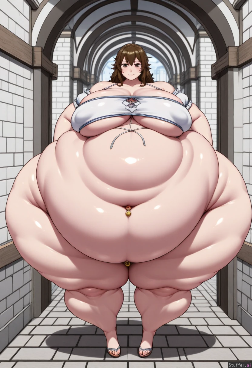 (simple colors, flat colors, simple shading), masterpiece, best quality, high rating, anime style 1girl, alone, solo, only one person, petite, fragile build, head in proportion to body, normal head size, realistic head-to-body ratio, brown hair, long brown hair, messy hair, wearing a poor ragged medieval dress, tattered dress, patched fabric, worn-out dress, simple linen dress, peasant dress, standing in a medieval corridor, stone hallway, castle corridor, arched windows, torches on walls, empty hallway, no other people, delicate frame, (big breasts:3.1), (thin chest:0.8), (wide hips:1.5), (natural belly button:1.2)(morbidly obese: 2.3), (extreme large belly: 1.9)(belly to the floor: 1.4),(one belly button:1.8), (single navel:1.8), natural belly button, realistic navel, single belly button, only one navel exposed belly, bare midriff, belly visible, stomach uncovered, crop top, midriff showing, wearing a poor ragged medieval dress with torn neckline, deep decolletage, chest exposed, low-cut top, revealing cleavage, dress falling off shoulders, bare upper chest sweating, sweaty skin, beads of sweat on forehead, perspiration on face, glistening skin, (long eyelashes:1.1), smiling, happy expression, slight smile, soft smile, gentle smile pale skin, slight blush on cheeks, (long legs: 1.6) (medieval europe background, stone walls, wooden beams, old corridor, atmospheric lighting, dramatic shadows), 3/4 view, semi-side view, from the side at an angle, full body shot, standing pose, cinematic framing