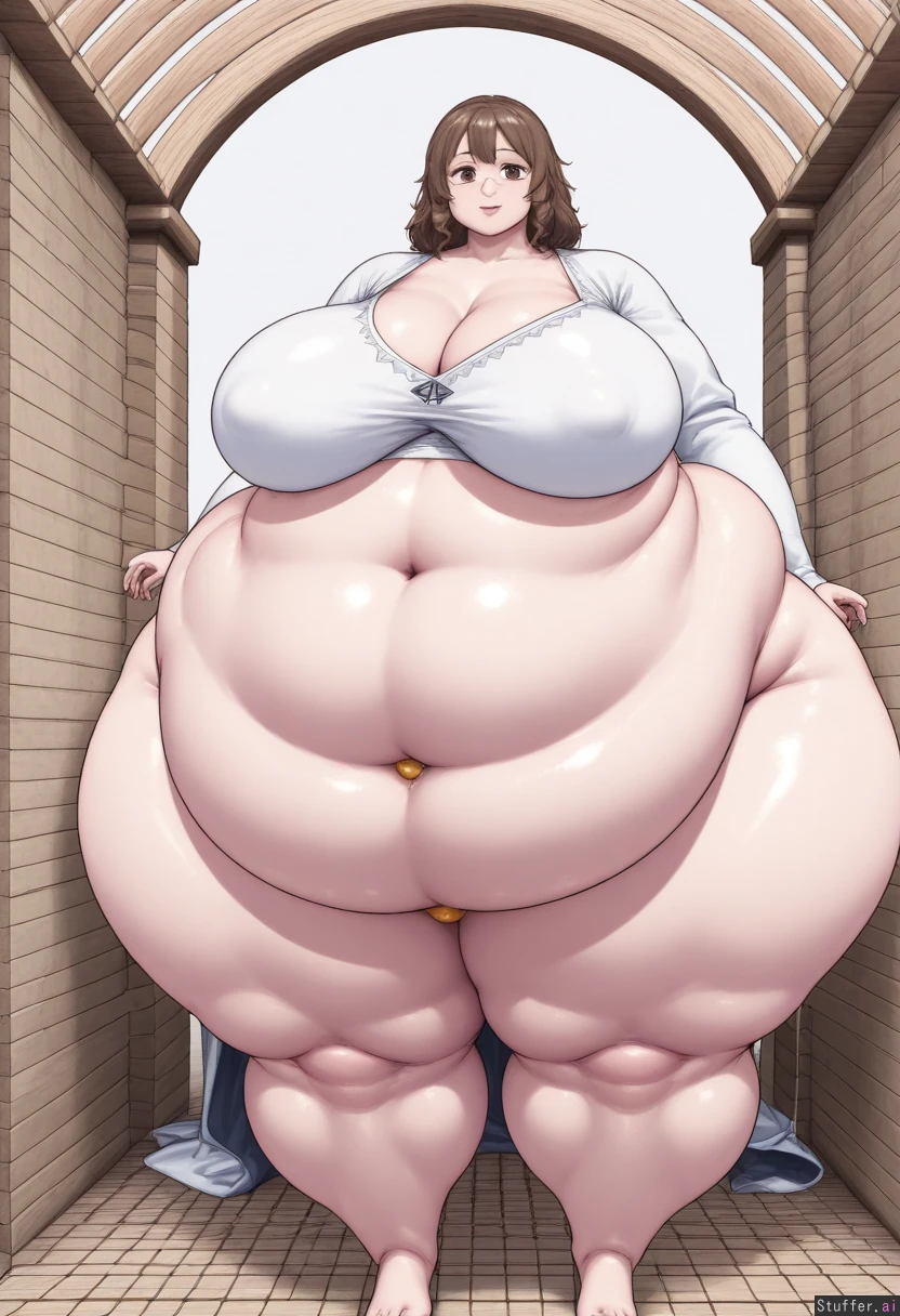 (simple colors, flat colors, simple shading), masterpiece, best quality, high rating, 1girl, alone, solo, only one person, petite, fragile build, head in proportion to body, normal head size, realistic head-to-body ratio, brown hair, long brown hair, messy hair, wearing a poor ragged medieval dress, tattered dress, patched fabric, worn-out dress, simple linen dress, peasant dress, standing in a medieval corridor, stone hallway, castle corridor, arched windows, torches on walls, empty hallway, no other people, delicate frame, (big breasts:3.1), (thick legs: 2.0), (wide hips:1.5), (plumb face: 1.8) (natural belly button:1.2)(morbidly obese: 2.3), (extreme large belly: 1.9)(belly to the floor: 1.4),(one belly button:2.0), (single navel:1.8), natural belly button, realistic navel, single belly button, only one navel exposed belly, bare midriff, belly visible, stomach uncovered, crop top, midriff showing, wearing a poor ragged medieval dress with torn neckline, deep decolletage, chest exposed, low-cut top, revealing cleavage, dress falling off shoulders, bare upper chest sweating, sweaty skin, beads of sweat on forehead, perspiration on face, glistening skin, (long eyelashes:1.1), smiling, happy expression, slight smile, soft smile, gentle smile pale skin, slight blush on cheeks, (long legs: 1.6) (medieval europe background, stone walls, wooden beams, old corridor, atmospheric lighting, dramatic shadows), 3/4 view, semi-side view, from the side at an angle, full body shot, standing pose, cinematic framing