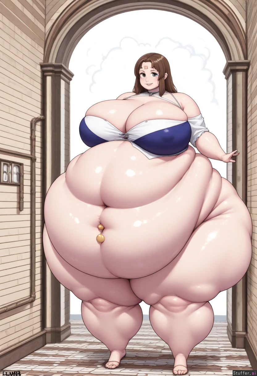 (simple colors, flat colors, simple shading), masterpiece, best quality, high rating, 1girl, alone, solo, only one person, petite, fragile build, head in proportion to body, normal head size, realistic head-to-body ratio, brown hair, long brown hair, messy hair, wearing a poor ragged medieval dress, tattered dress, patched fabric, worn-out dress, simple linen dress, peasant dress, standing in a medieval corridor, stone hallway, castle corridor, arched windows, torches on walls, empty hallway, no other people, delicate frame, (big breasts:3.1), (thick legs: 2.0), (wide hips:1.5), (plumb face: 1.8) (natural belly button:1.2)(morbidly obese: 2.3), (extreme large belly: 1.9)(belly to the floor: 1.4),(one belly button:2.0), (single navel:1.9), natural belly button, realistic navel, single belly button, only one navel exposed belly, bare midriff, belly visible, stomach uncovered, crop top, midriff showing, wearing a poor ragged medieval dress with torn neckline, deep decolletage, chest exposed, low-cut top, revealing cleavage, dress falling off shoulders, bare upper chest sweating, sweaty skin, beads of sweat on forehead, perspiration on face, glistening skin, (long eyelashes:1.1), smiling, happy expression, slight smile, soft smile, gentle smile pale skin, slight blush on cheeks, (long legs: 1.6) (medieval europe background, stone walls, wooden beams, old corridor, atmospheric lighting, dramatic shadows), 3/4 view, semi-side view, from the side at an angle, full body shot, standing pose, cinematic framing