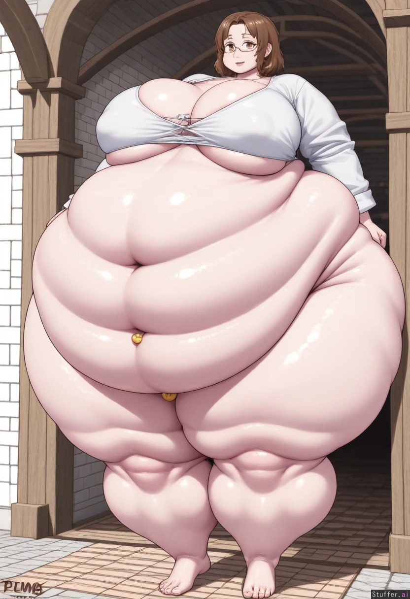 (simple colors, flat colors, simple shading), masterpiece, best quality, high rating, 1girl, alone, solo, only one person, petite, fragile build, head in proportion to body, normal head size, realistic head-to-body ratio, brown hair, long brown hair, messy hair, wearing a poor ragged medieval dress, tattered dress, patched fabric, worn-out dress, simple linen dress, peasant dress, standing in a medieval corridor, stone hallway, castle corridor, arched windows, torches on walls, empty hallway, no other people, delicate frame, (big breasts:3.1), (thick legs: 2.0), (wide hips:1.5), (plumb face: 1.8) (natural belly button:1.2)(morbidly obese: 2.3), (extreme large belly: 1.9)(belly to the floor: 1.4),(one belly button:2.0), (single navel:1.9), natural belly button, realistic navel, single belly button, only one navel exposed belly, bare midriff, belly visible, stomach uncovered, crop top, midriff showing, wearing a poor ragged medieval dress with torn neckline, deep decolletage, chest exposed, low-cut top, revealing cleavage, dress falling off shoulders, bare upper chest sweating, sweaty skin, beads of sweat on forehead, perspiration on face, glistening skin, (long eyelashes:1.1), smiling, happy expression, slight smile, soft smile, gentle smile pale skin, slight blush on cheeks, (long legs: 1.6) (medieval europe dark background, stone walls, wooden beams, old corridor, atmospheric lighting, dramatic shadows), 3/4 view, semi-side view, from the side at an angle, full body shot, standing pose, cinematic framing