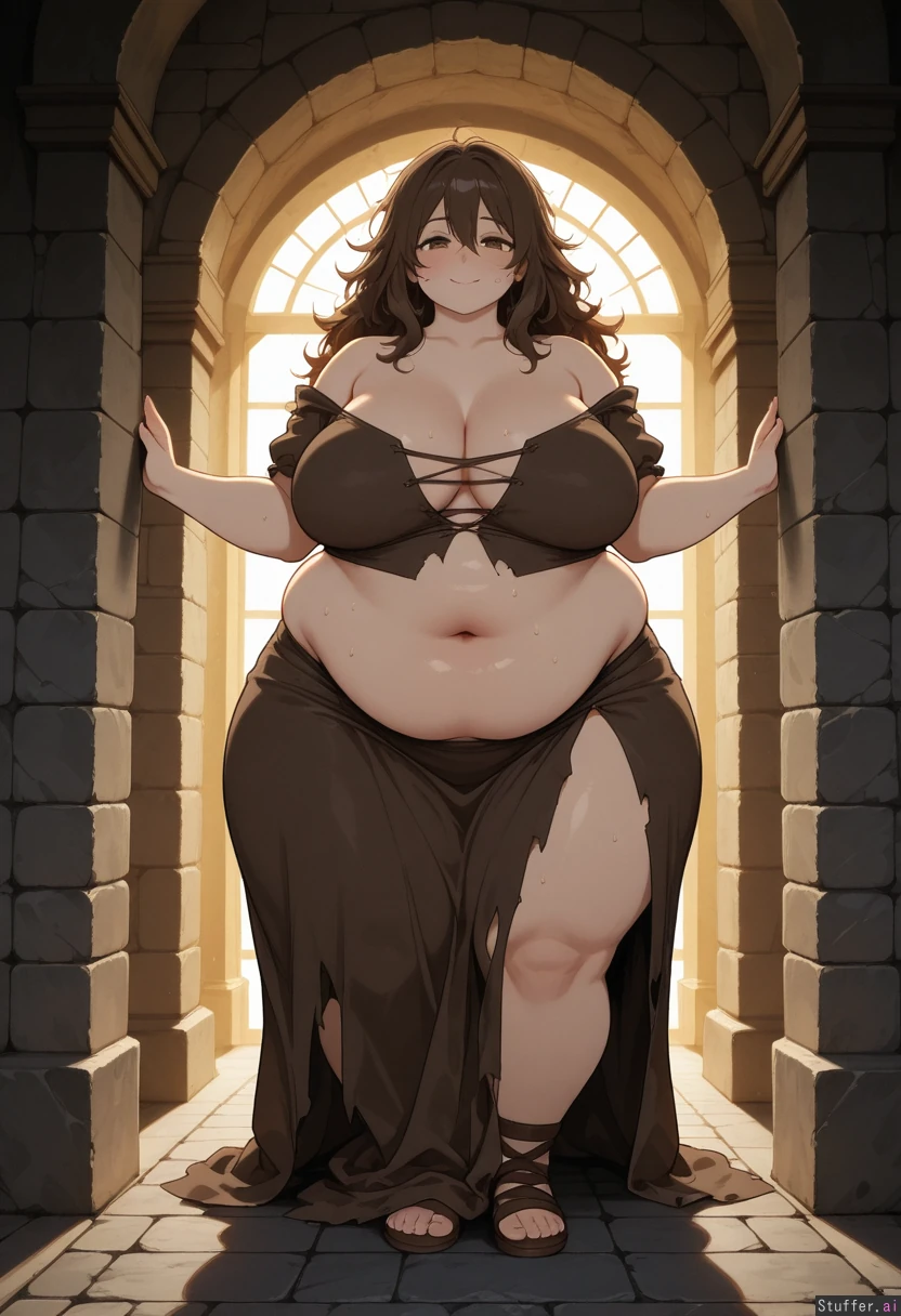 (simple colors, flat colors, simple shading), masterpiece, best quality, high rating, 1girl, alone, solo, only one person, petite, fragile build, brown hair, long messy hair, wearing a poor ragged medieval dress, torn neckline, chest exposed, bare upper chest, dress falling off shoulders, exposed belly, bare midriff, standing in a medieval corridor, stone walls, torches, empty hallway, morbidly obese, extreme large belly, belly to the floor, wide hips, thick legs, plump face, big breasts, one belly button, single navel, sweating, glistening skin, long eyelashes, smiling, soft smile, pale skin, slight blush, medieval dark background, atmospheric lighting, dramatic shadows, 3/4 view, side angle, full body shot, standing pose, cinematic framing