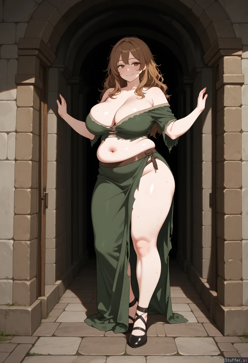 (simple colors, flat colors, simple shading), masterpiece, best quality, high rating, 1girl, alone, solo, only one person, petite, fragile build, brown hair, long messy hair, wearing a poor ragged medieval dress, torn neckline, chest exposed, bare upper chest, dress falling off shoulders, exposed belly, bare midriff, standing in a medieval corridor, stone walls, torches, empty hallway, USSBBW, extreme large belly, belly to the floor, wide hips, thick legs, plump face, big breasts, one belly button, single navel, sweating, glistening skin, long eyelashes, smiling, soft smile, pale skin, slight blush, medieval dark background, atmospheric lighting, dramatic shadows, 3/4 view, side angle, full body shot, standing pose, cinematic framing