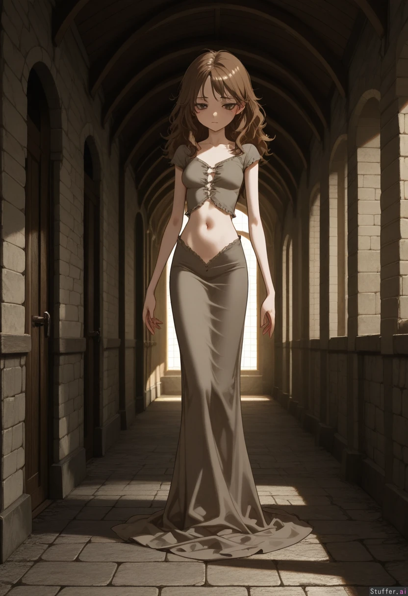 (simple colors, flat colors, simple shading), masterpiece, best quality, high rating, 1girl, alone, solo, only one person, thin girl, slender body, petite, fragile build, brown hair, long brown hair, messy hair, wearing a poor ragged medieval dress, tattered dress, patched fabric, worn-out dress, simple linen dress, peasant dress, standing in a medieval corridor, stone hallway, castle corridor, arched windows, torches on walls, empty hallway, no other people, skinny, thin arms, thin legs, delicate frame, (big breasts:1.0), (thin chest:1.2), (narrow hips:1.1), slender waist, (natural belly button:1.2), (long eyelashes:1.1), sad expression, looking down, tired eyes, dark circles under eyes, hollow cheeks, pale skin, slight blush on cheeks, (medieval europe background, stone walls, wooden beams, old corridor, atmospheric lighting, dramatic shadows), side view, full body shot, standing pose, cinematic framing, wide shot, from a distance