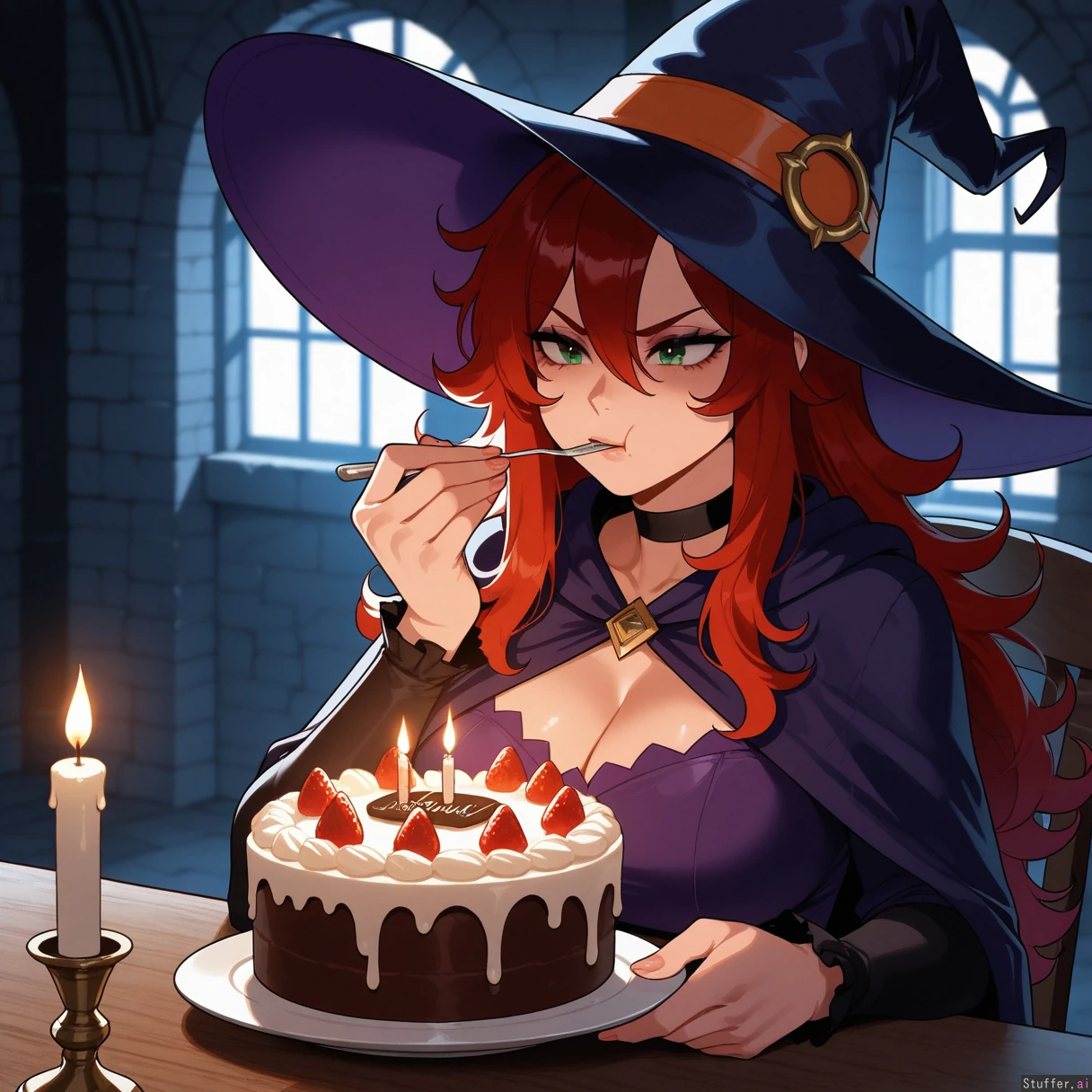 Masterpiece, best_quality, beautiful, vibrant colors, dim light, (1girl), nyantcha(artist), alone, long hair, red hair, green eyes, witch, dungeon, annoyed, eating cake, (overweight:0.5)