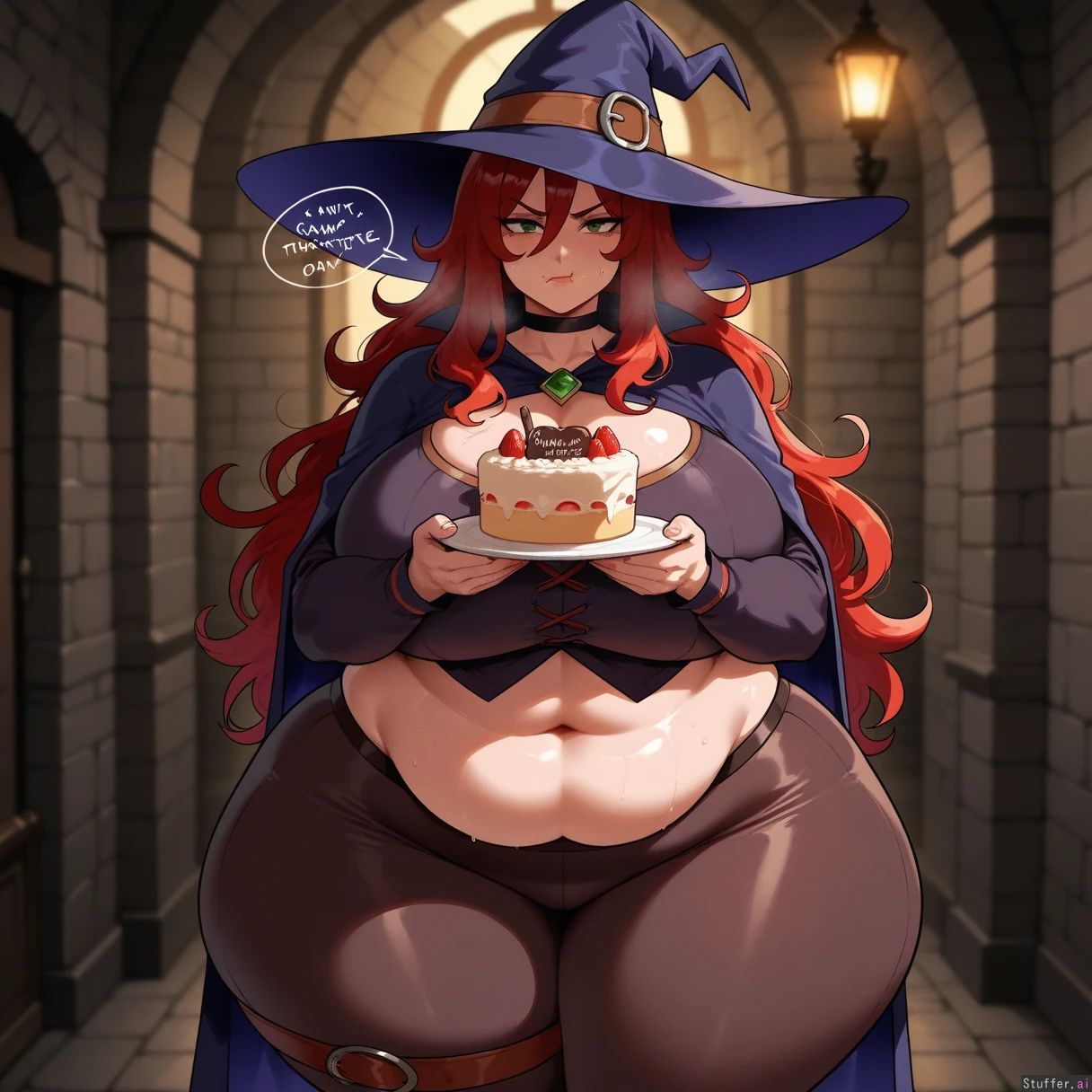 Masterpiece, best_quality, beautiful, vibrant colors, dim light, (1girl), nyantcha(artist), alone, long hair, red hair, green eyes, witch, dungeon, annoyed, eating cake, standing, midriff, brown tights, panting, sweating, out of breath, ((gigantic thighs, fat ass, wide hips, morbidly obese):1.0)