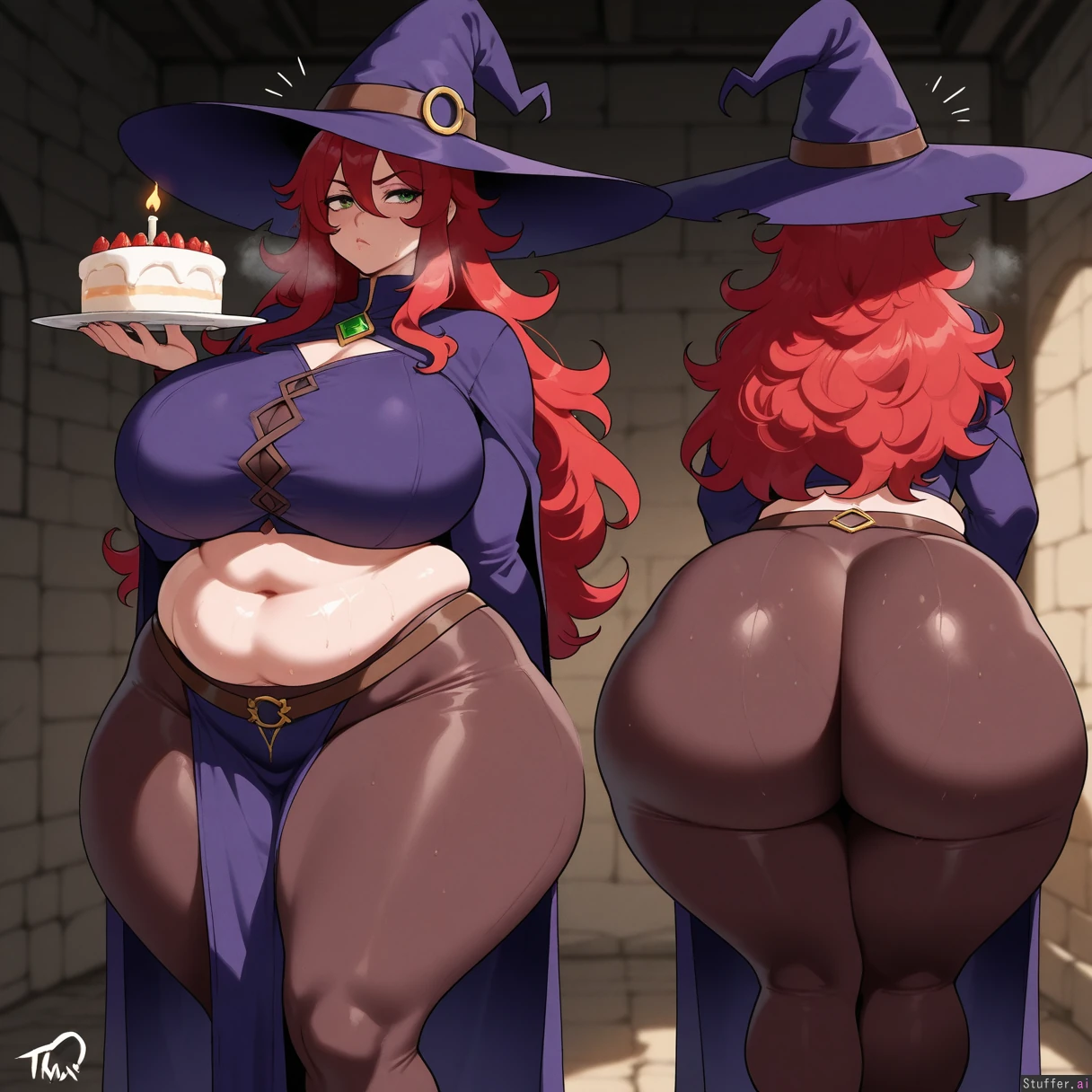 Masterpiece, best_quality, beautiful, vibrant colors, dim light, (1girl), nyantcha(artist), alone, long hair, red hair, green eyes, witch, dungeon, annoyed, eating cake, standing, midriff, brown tights, panting, sweating, out of breath, front view, ((gigantic thighs, wide hips, fat ass, overweight):1.15)